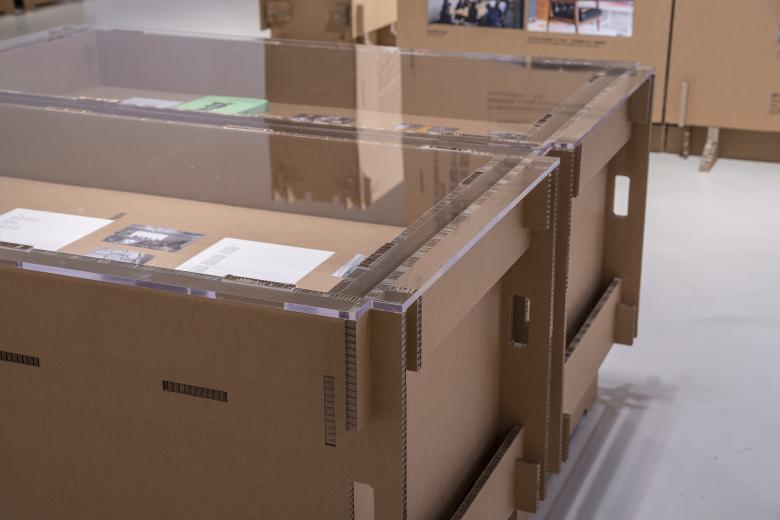 Corrugated cardboard is relatively light compared to other conventional construction materials. In order to stabilize the exhibition walls and stands, a number of construction measures have been carried out. One of the measures is to install supporting legs and skirtings. Each 1.2m-wide module is 15cm above the floor and is equipped with 3 plates as supporting legs, and each plate protrudes 15cm from the exhibition wall in both directions .It helps avoiding damage to the cardboard walls caused by visitors who touch unintentionally by feet when standing and watching the exhibits. Besides, the cardboard walls are reinforced simultaneously. Inside each module, certain amount of space is reserved for setting a sandbox (existing props owned by Power Station of Art) as a counterweight, so that each single module has enough load-bearing capacity to ensure stability in case of that the cardboard walls are touched or pushed. Furthermore, the 3.6m-wide walls formed by every three modules are connected with each other near the center of each column. Connected by steel components, the overall structure can be further stabilized.