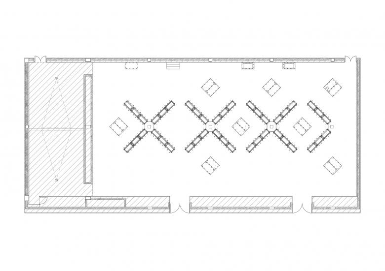 We believe that these columns are not the negative part in the space, and they are not necessarily to be wrapped either. As the space is strongly defined by the regular columns, they can be used as the basic elements to create spatial order. Radiating from the center of each column, four display walls are combined to form an "X" shape on the plane. Each integrated "X"-shaped wall divides the space around each column into four isosceles triangular areas facing outwards. Meanwhile, two halves of the "X-wall" in between the columns form an inward-facing rectangular space. These two types of spaces can satisfy the needs of dividing the exhibition into different sections for various curators, allowing for greater flexibility and orderliness.