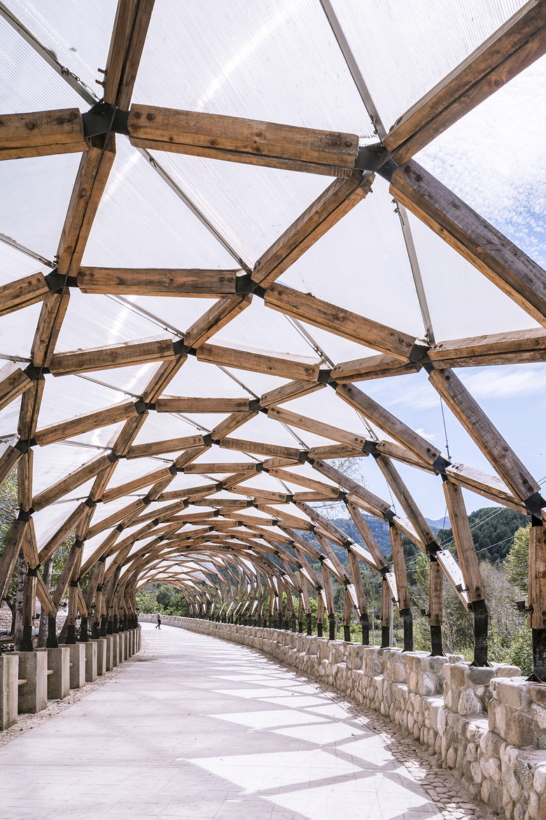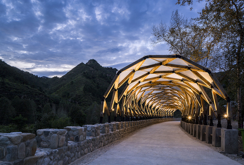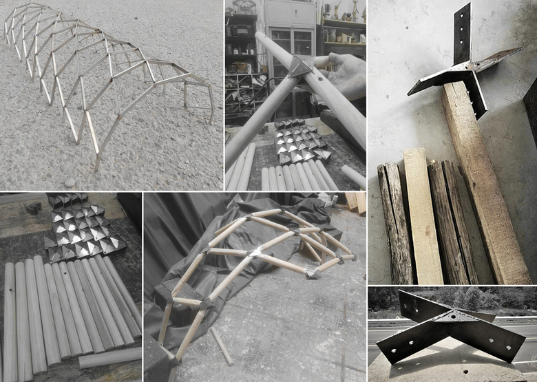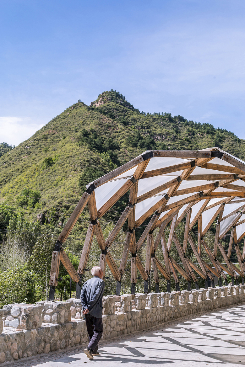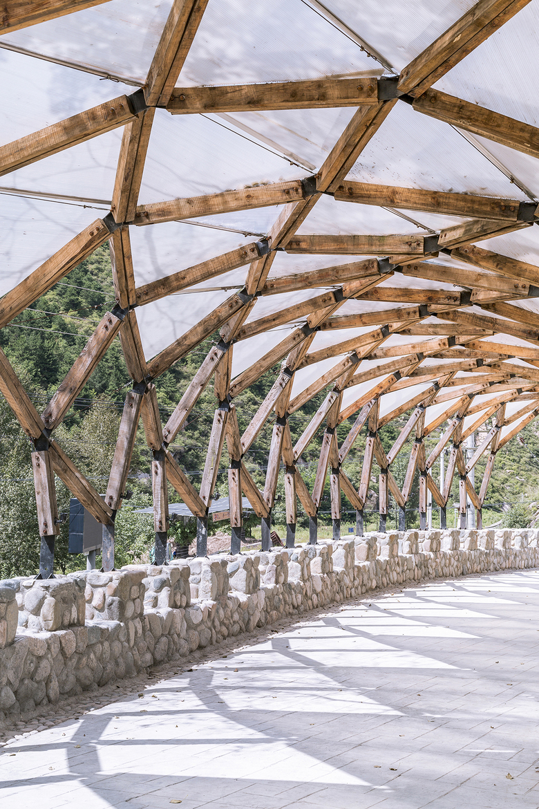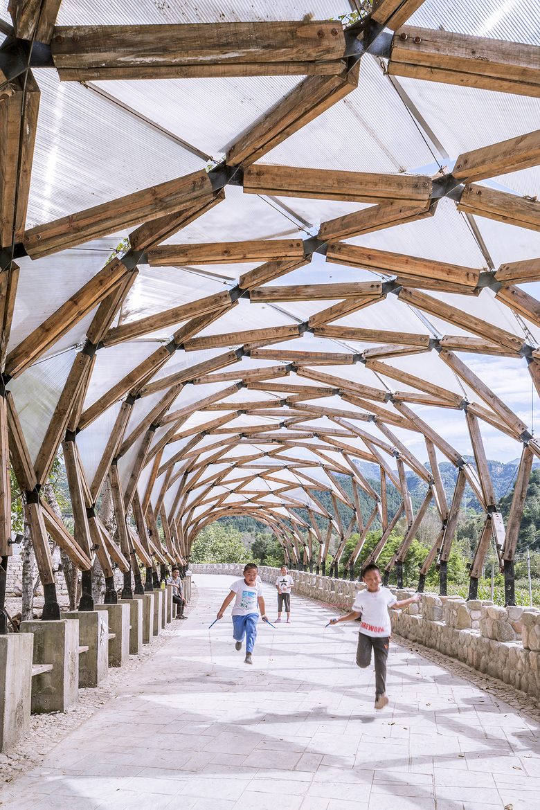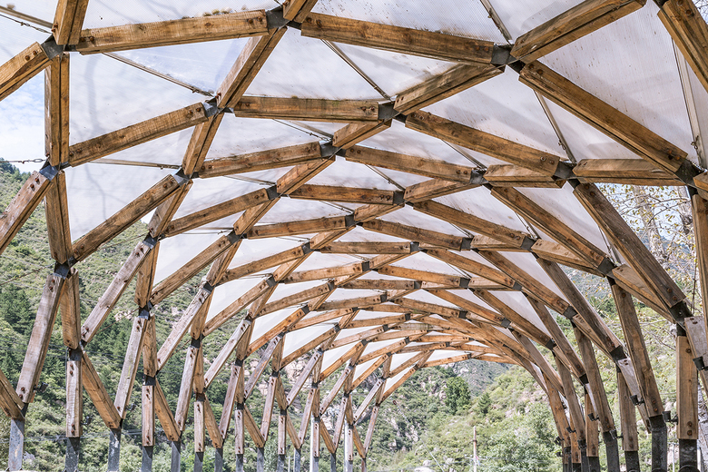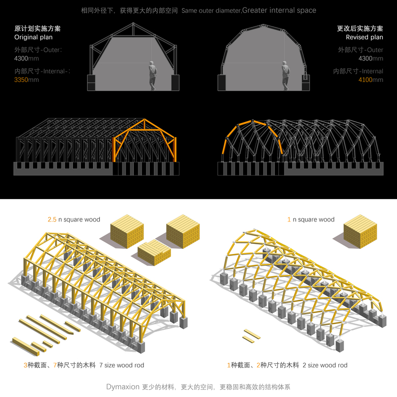 如果能够将建造单元材料尽量拆分小,这样就可以获得更多闲弃木料的再利用可能,可以组织村民靠普通人力就建设完成;单元杆件形成结构体系,可以得到更好的稳定性和一个更大的空间;网络化结构在日久累月的使用中,假如出现自然力破坏,也会得到更大的安全系数。通过这种建造手段,实现了更少的资金投入、更便捷的人力建造。