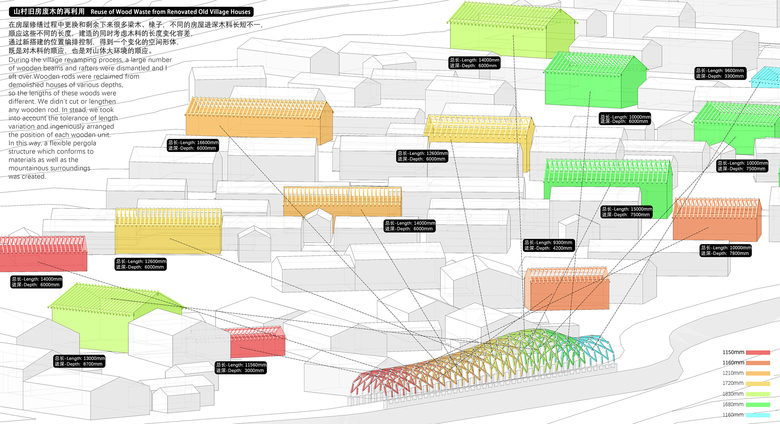 遵从木料的长度不一,形成和山体大环境的自然契合:废木料收集自拆下的房屋,不同的房屋进深搭建的时候木料也长短不一,顺应这些不同的长度,建造的同时考虑木料的长度变化容差,通过搭建的位置编排控制,得到一个变化的空间形体,既是对木料的顺应,也是对山体大环境的顺应。