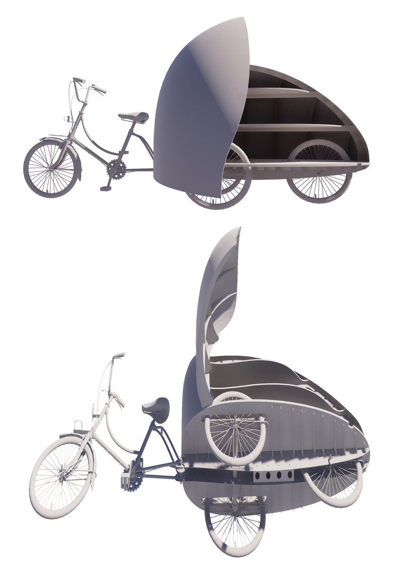要陈放多一些的物品,将共享单车改造成承载量大的三轮车架。避免来回搬运物品和安全性,要对储物架进行遮盖。一个有意思的遮盖、一种更具创意的打开方式被充分想象,七星瓢虫是小朋友们相对比较了解的有益甲虫,选择将瓢虫翅翼打开的方式,运用到三轮货架的遮盖开合理念上。这种开合状态使得货架相对较长,为了综合稳定性,在整车尾部增加了一个万向的辅助轮。根据封闭的内空间合理设置陈放层台,多层的设计方便储物也增强了整车结构,结合上层小下层大的特点,首层板宽度大设置了可以坐靠的空间。