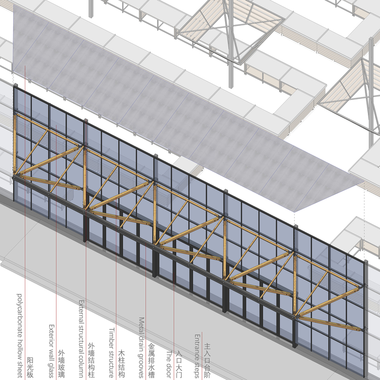 入口雨棚的增建,基于纵向模块和横向窗扇玻璃的间隔,也采用了相对最稳固又省料的四面锥结构方式。