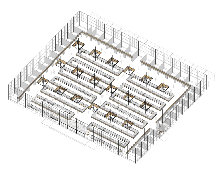标准的工业大棚空间,是均质而无序的。常规菜市场的问题就是辨识混乱,如何通过必要的增建,在无序的空间里营造出秩序,方便贩卖管理和市民采购,是设计的第二个议题。增建添加必须满足两个条件:尊重和利用现有结构和构造杆件的模数、新增建造是非标准构件(再用性弱)必须低造价。