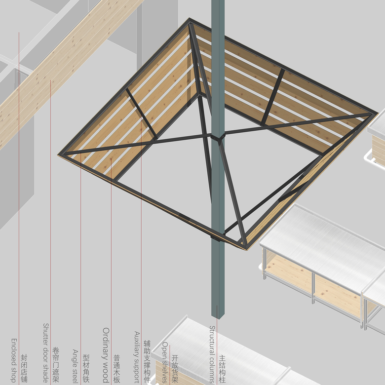 封闭式店铺选择三面围合环外墙设置,减少了一个墙面的封闭,结合外立面主结构杆件的构造模数,每个铺房为4米*4米的开间和进深,封闭店铺售卖的多是干货、熟食、香料等相对大规模的店,一店一名,铺门采用的是卷帘门,卷帘门的上檐口有突出卷轴,通过角钢和木板格栅进行遮蔽防护,并贯通各店做统一高度尺寸的标识招牌。