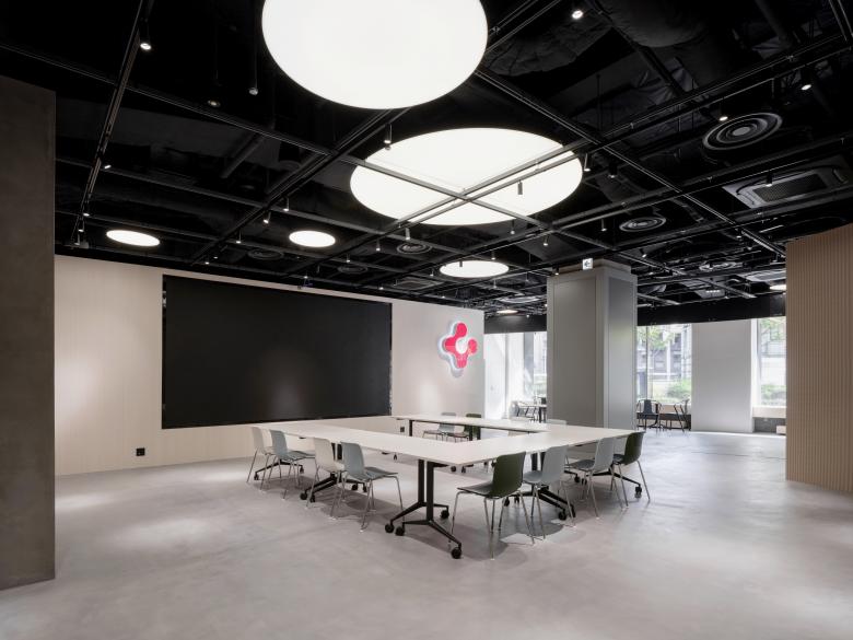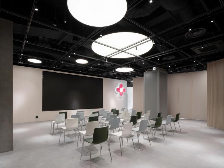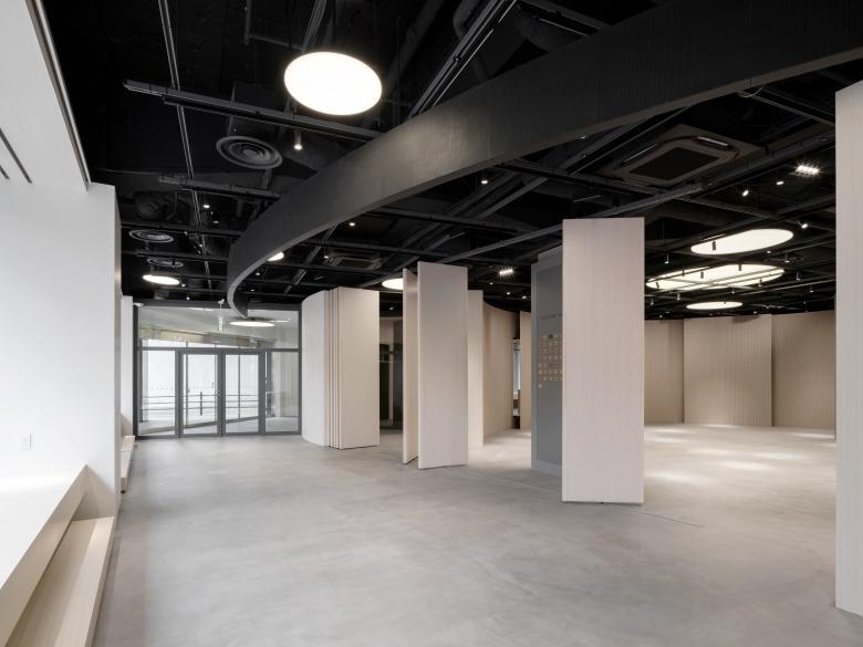 Der bestehende Raum wurde weitgehend erhalten und mit punktuellen Eingriffen und mit Hilfe drei ineinander greifenden Volumen neu gegliedert. Um maximale Flexibilität zu bewahren wurden grosse dreh-und schiebbare Paneele eingesetzt, welche unterschiedliche Konstellationen erlauben, von offen bis komplett geschlossen und somit verschiedene Grade von Privatheit für unterschiedliche Anlässe gewährleisten. Als Raum mit flexiblem Filter kann dieser sowohl für öffentliche Ausstellungen und Veranstaltungen, sowie für Seminare und Konferenzen mit einer Personenbelegung von bis zu 80 Personen verwendet werden.