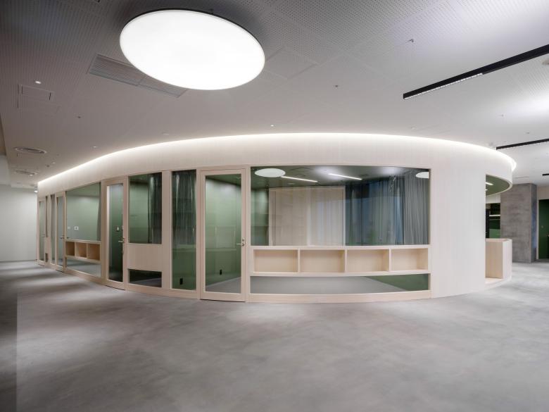Die Gestaltung eines fliessenden und dynamischen Raumes erlaubt es den Arbeits- und Veranstaltungsbereich räumlich von einander zu trennen und sie gleichzeitig visuell miteinander zu verbinden. Innere Verglasungen verleihen dem Raum die gewünschte Offenheit und Transparenz und lassen Tageslicht bis tief in den Raum fliessen. Die Materialisierung der Volumen in hellem Holz bildet einen Kontrast zum rohen Zustand der Decke und wird durch textile Oberflächen im Arbeitsbereich, welche für Wärme und Behaglichkeit sorgen, ergänzt.
