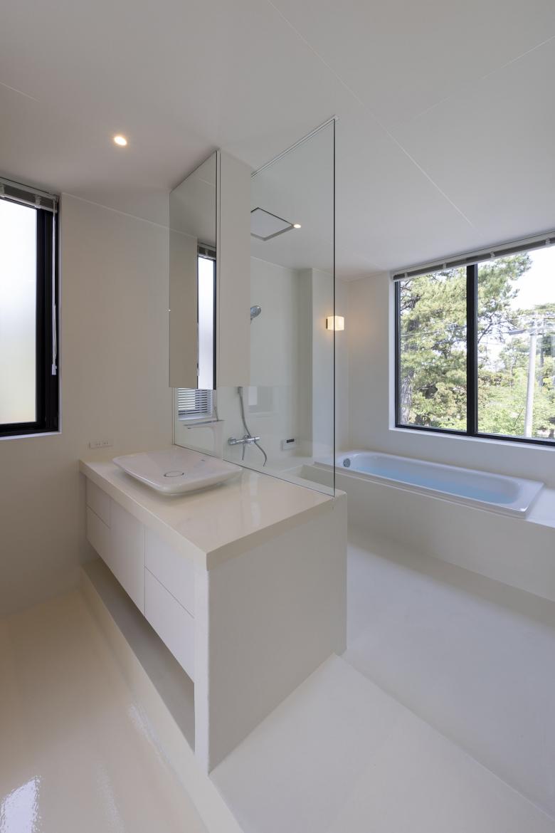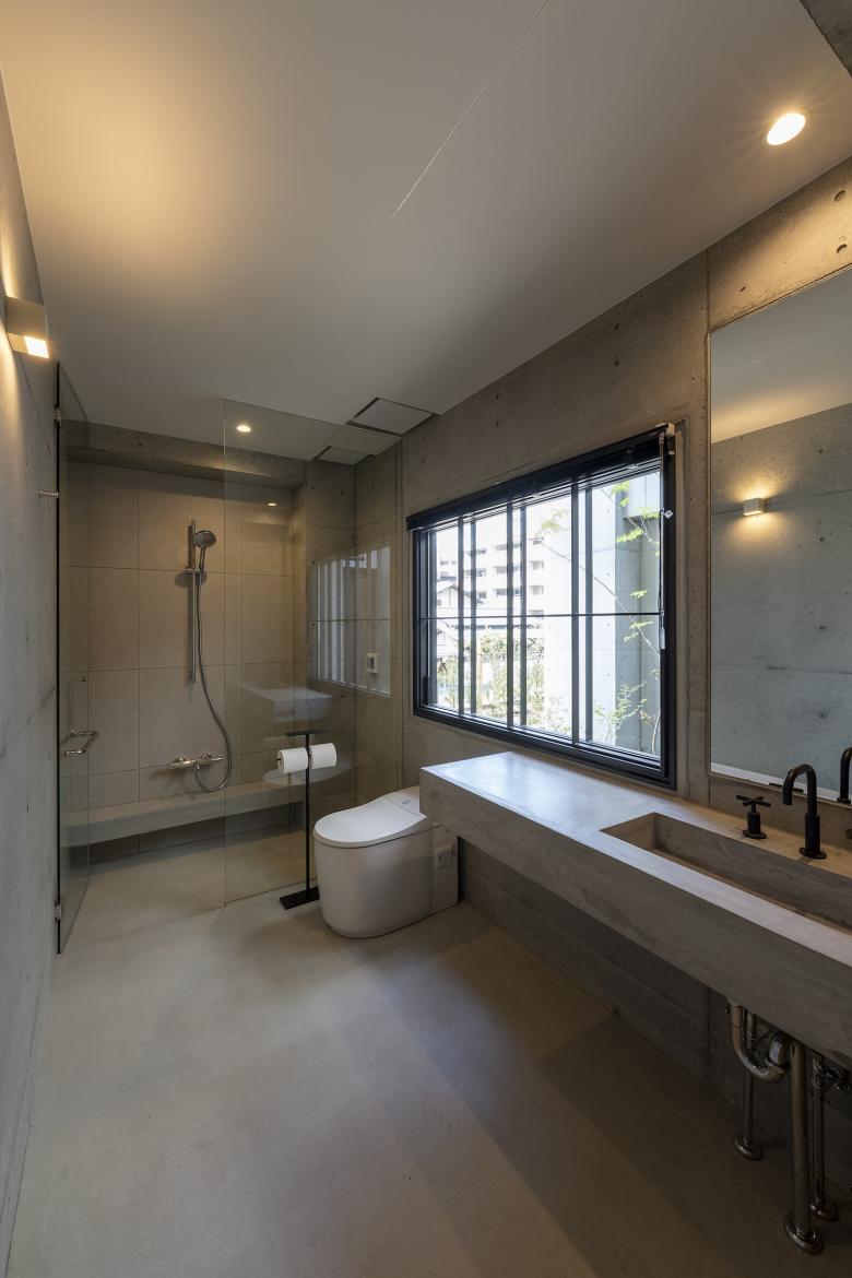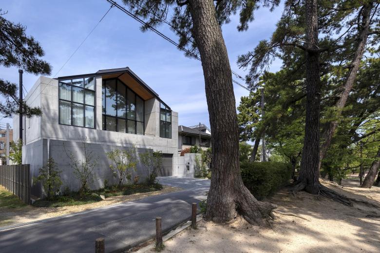 The design creates a fundamentally visible yet private environment by establishing a frontage facing the road as a lush open space incorporating parking and an approach.The exterior walls are finished entirely in exposed concrete, while the roof is gabled, spanning over H-beam girders. This combination of concrete and H-beam creates a dynamic impression.