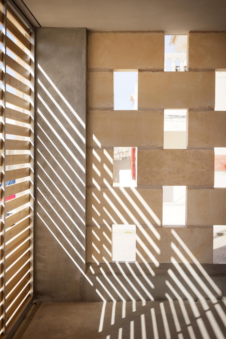 The house is constructed with load-bearing concrete walls, generous exterior insulation with stucco that relates to the ground on the facades with a variable-height marés plinth. The floor slabs are made of concrete, the windows are aluminum, and the blinds are sliding, either aluminum or wood depending on the case.
