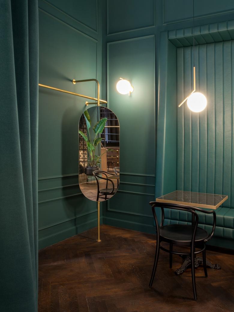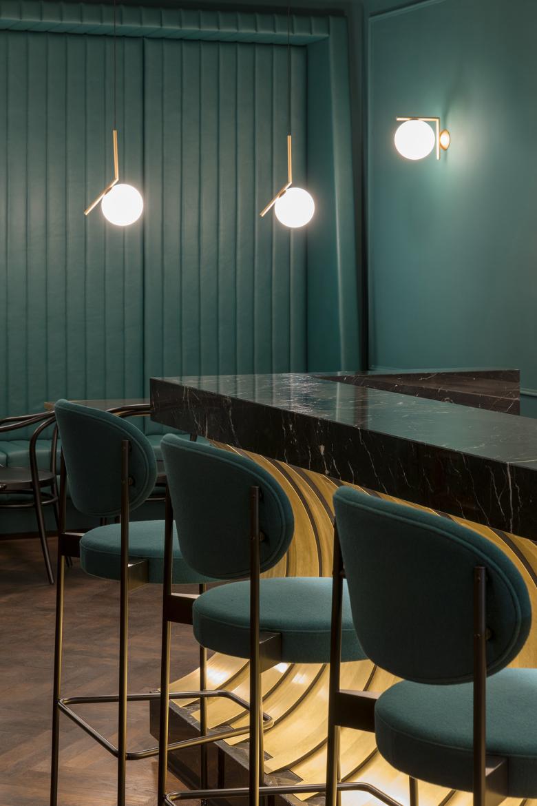Das Interieur, umhüllt von blaugrünen Wänden mit Stuckelementen, setzt die Bar aus schwarzem Marmor in Kombination mit Messing gekonnt in Szene. Ein 100 Jahre alter Parkettboden der in Handarbeit abgetragen und neu verlegt wurde, sowie Tische im Wiener Kaffeehausstil und Kugellampen runden das ansprechende Gesamtkonzept ab. Ein besonderes Highlight bildet ergänzend dazu der eigens designte Luster, der schwerelos über der Bar zu schweben scheint.