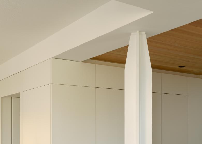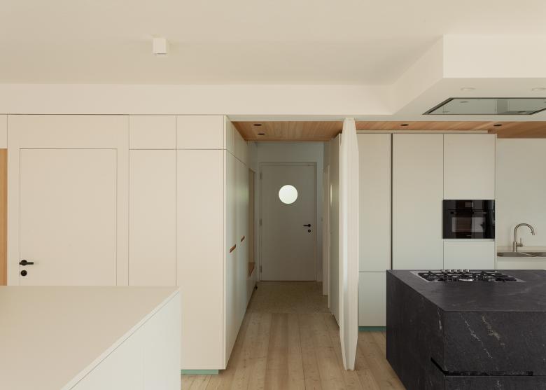 The demand for more day light and brightness was met by installing two openings: one on the north and one on the south façade. On the northside, a room-high sliding door that opens to the garden was installed. The living quarters on the southside open to the front yard through long-stretched, flush fixed glazing. The fluid arrangement of rooms on the ground floor is defined by a large built-in furniture which on its exterior functions as storage space for entrance, kitchen and living room, while harboring a bathroom at the interior.