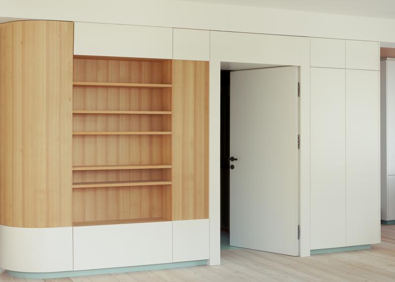 Materials, colors and surface feels were informed by our client’s wish for solid wood floors. On the ground floor we went with white larch, brushed and oiled, and on the first floor the choice was spruce, again, brushed and oiled.
