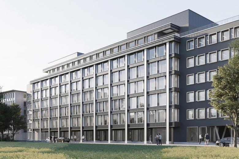 Der Umbau macht sich die Qualitäten des Bestandsbaus aus den 1970er Jahren zunutze. Das vorhandene Stützraster erhält mit Fensterbändern einen Gegenpol, der die Horizontale des Gebäudes betont. Breite und schmale Fenster, die sich abwechseln und in ihrer Tiefe verspringen, lassen viel Licht ins Innere und zeichnet gleichzeitig ein lebendiges Fassadenbild: offen und modern statt gläsern-kalt.