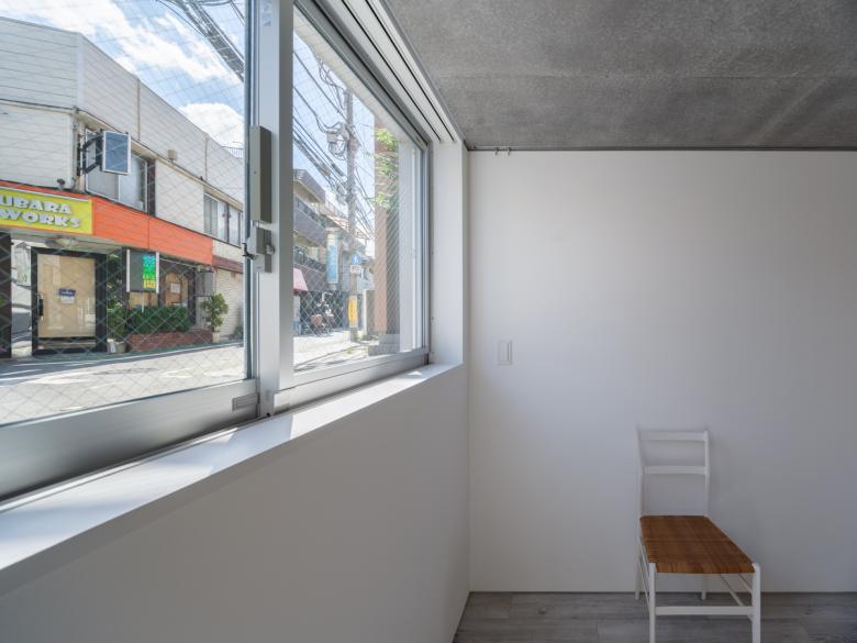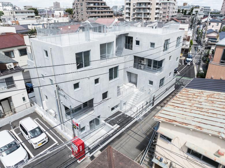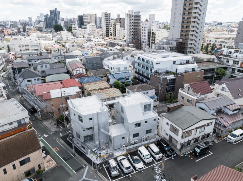 東京郊外の中山道から一本路地を入った先の角地に敷地は位置している。周辺では幅の狭い商店街の街路に沿って兼用住宅が稠密に建て込み、駐車場が空地として点在している。良好な住環境とは言い難い周辺なので、敷地内に住民のための空地的な場所をつくりたいと考え、コンパクトなボリュームにまとめて外部空間を確保する方針と、また設計を始めて間も無くしてコロナ禍となったことも併せて共用部のない長屋を検討することにした。
