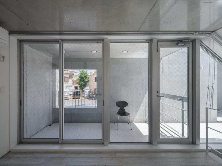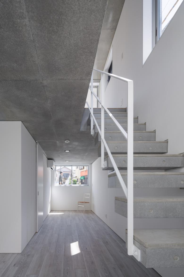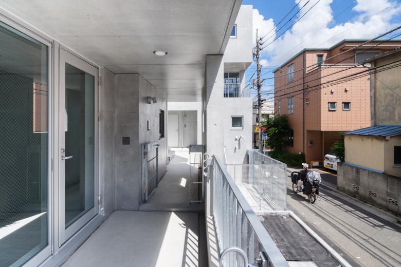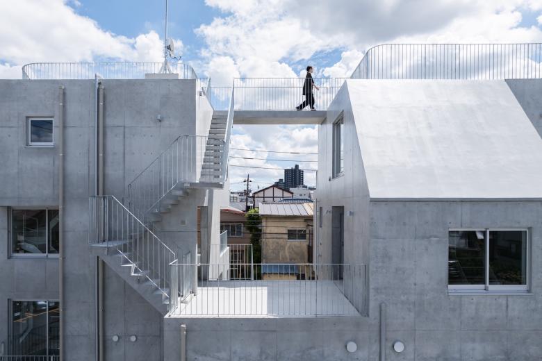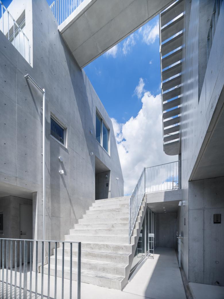 各住戸へのアプローチは上空が開放された階段状の基壇に上るので、一度住人がその場に集まるが、一方でそこからは各住戸へ独立した入口をもつ。コモンとプライベートが重なったような場所である。階段状の基壇は建築化された外部なので、共用部をもたない厳密な意味での長屋の形式とはいえない。