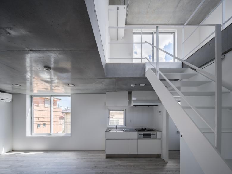 求められた床面積と住戸数から単純な長屋形式は採ることは難しい。そこで4つの住戸を包含し、半地下とした4階建ての2棟を離して配置し、その間を1つの住戸が入る基壇と屋上のブリッジによって繋ぐ構成とした。全て1/2階、3/4階の組み合わせのメゾネット住戸として、入口を2・3階に集約した重層長屋のような形式である。