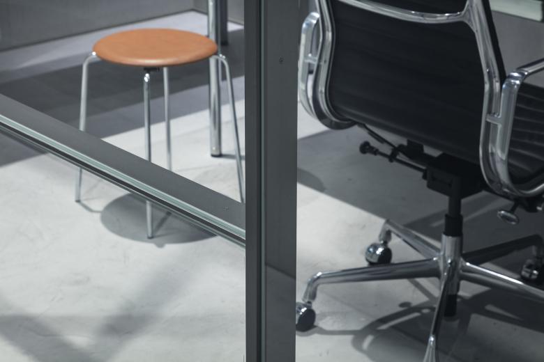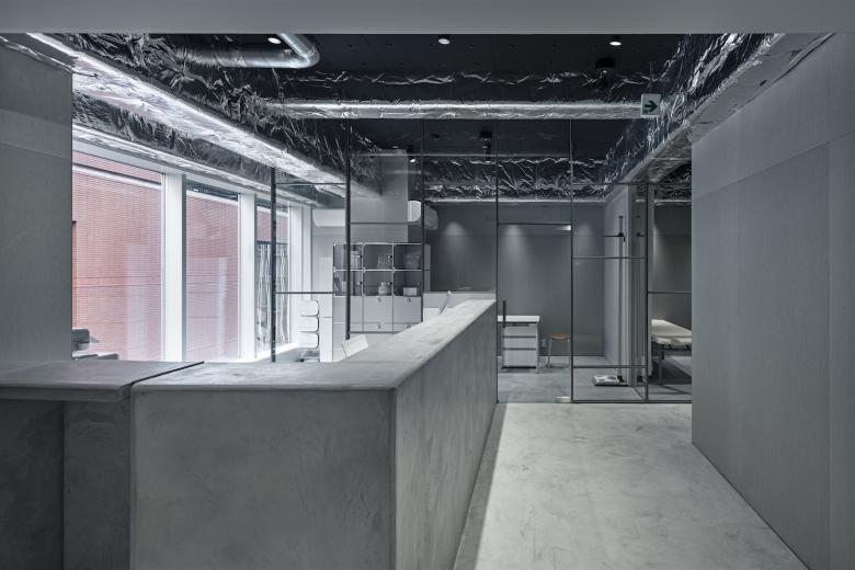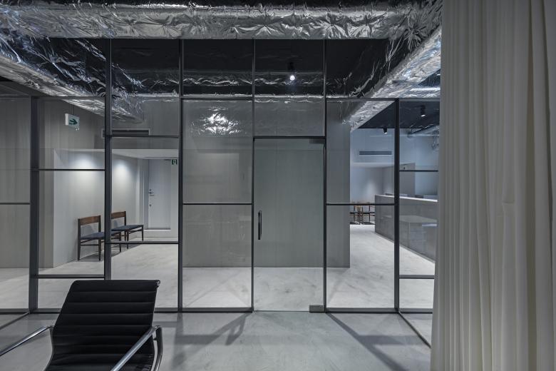 と、こう書いてしまえばなんてこともないのだが、医療系用途は非常に「かたい」用途である。医療法を考慮しなければならないし、レントゲン室などの特殊な室や医療機器に対する配慮も必要だ。そして、何よりも人々(医療従事者も、患者も)が期待する医療施設像は極めて保守的であり、天井を張らないことやガラスで間仕切ることには大きな抵抗がある。でもその抵抗は共同幻想ともいえるクリシェみたいなもので、よくよく話を聞いてみると明確な理由がなさそうだ。たとえばガラスの壁は傷付きにくいし、薬品にも強い。指紋は目立つけれどそれは汚れなのだから、拭けばむしろ衛生を保てる。診察室の音と視線の問題は天井から分厚めのレースのカーテンを重ねることで、運用上の支障はない。上階のスラブ下にグラスウールのマットを貼り、梁に設備配管の保温材を巻いて吸音しているので、音環境も悪くはない。そして何よりも奥の診察室にいても窓の外に銀座の風景が見えて開放的なのである。