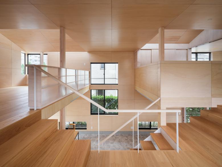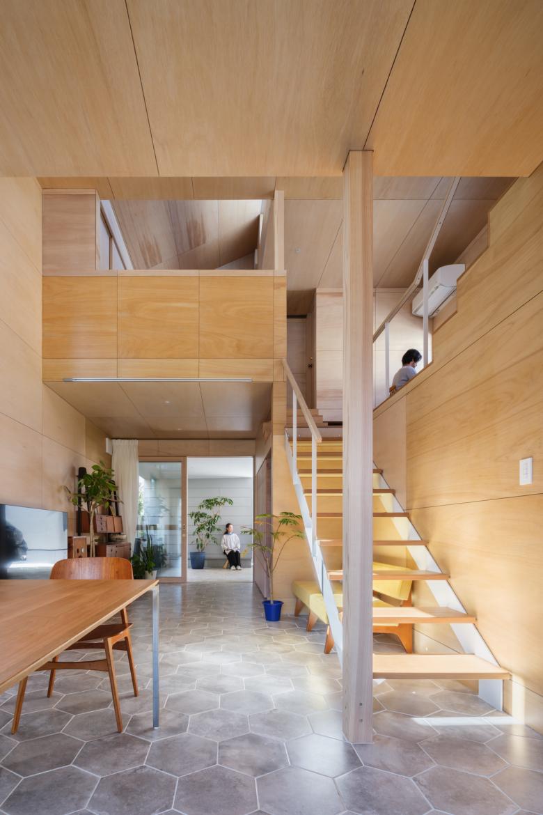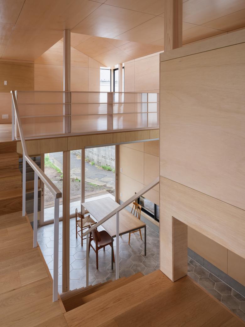 1階はポーチから連続する土間としてふたつの道を繋ぐ。幅1間半の開口部は道幅を参照した。内部は吹抜けも含めて天井高さをできるだけ高くして多方向から1階に光が落ちるようにすることで、路上を想起させる外部的な環境をつくっている。また、高度斜線がかかる北側の軒高を下げるため、1階水回り部分を掘り下げて中2階の床をつくり、そこから吹抜けに面して東西に2階の床を配置する、ほぼワンルームの構成とした。2階でもそれぞれの道の端部に正対するように窓を開けることで、稠密に建て込んだ低層住宅地にもかかわらず、ずっと向こう側まで視線が抜ける。それらの窓を介して、道に沿って吹いてくる風もそのまま内部を通って抜けていく。いろいろな虫も飛んで通り抜けていく。