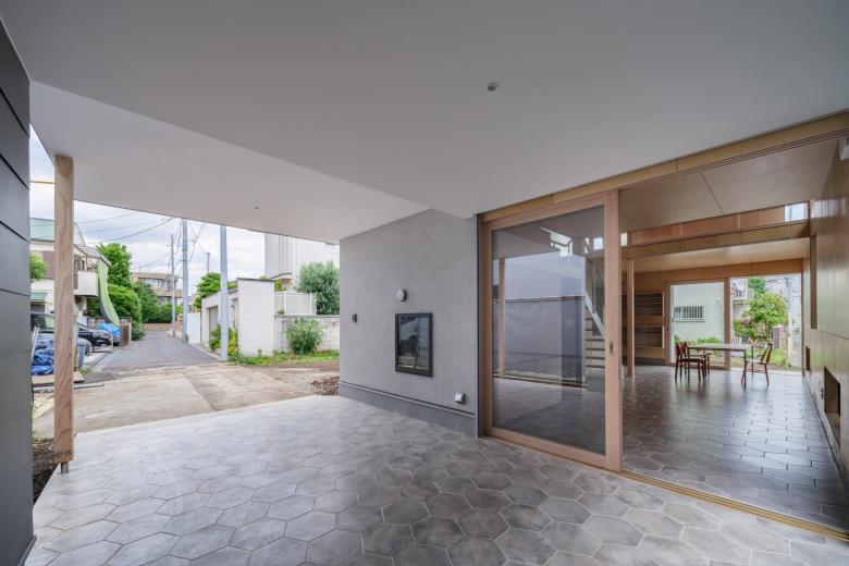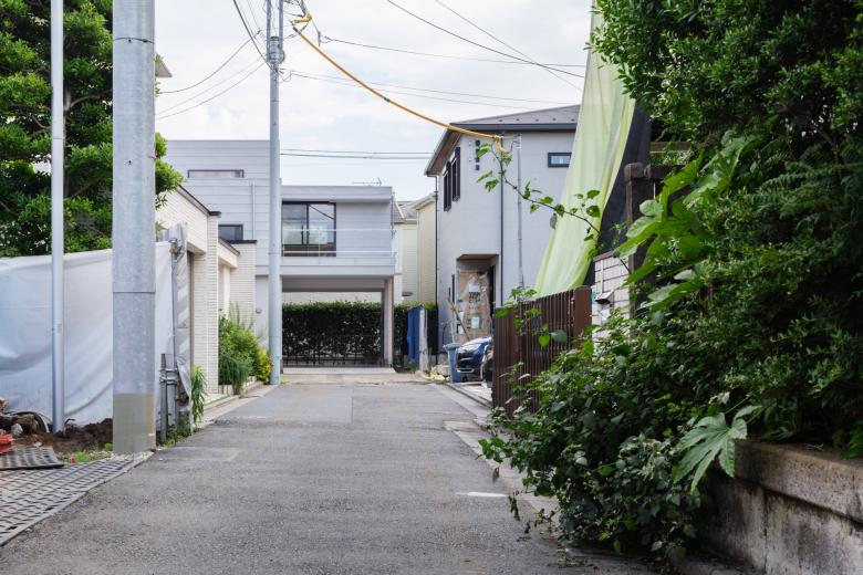 設計者の自宅である。戦後に妻の祖父が曽祖父から受け継いだ大きな敷地は、70年代に東西に分筆され、東の敷地に大ぶりな2世帯住宅を建てて祖父母が暮らしていた。彼らが亡くなった後、私たち家族がその家で7年ほど暮らした。敷地が北と東の2項道路の突き当たりに位置し、南側を空けて家が建っていたことから、私有地にもかかわらず軒先の庭をご近所さんが通り抜けの道として利用していた。その後、相続対策で2度目の分筆をして自宅を建てることとなった。敷地が引き続きふたつの道の突き当たりとなるような分筆のラインをデザインし、かつての通り抜けがそのまま残るように、道に架構を被せるイメージで住宅を配置した。