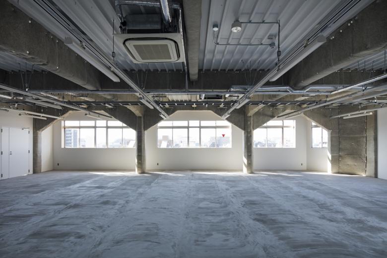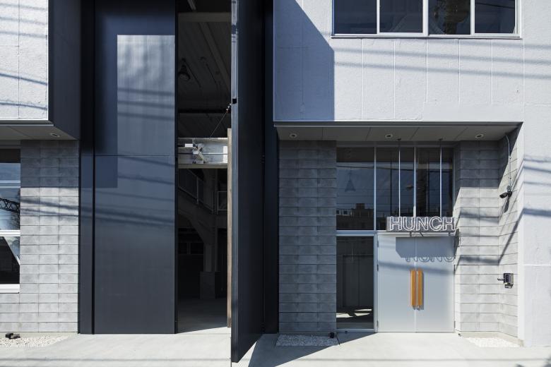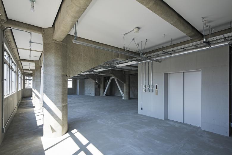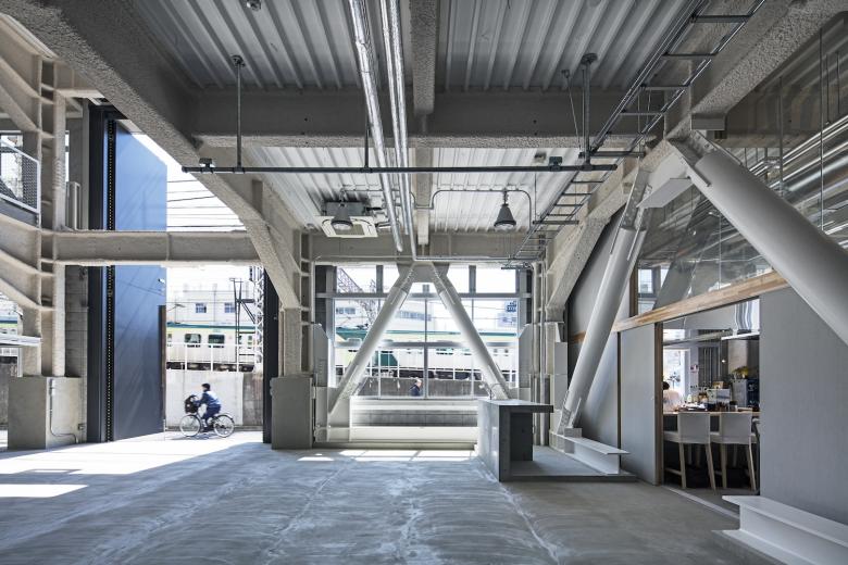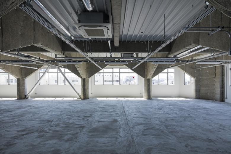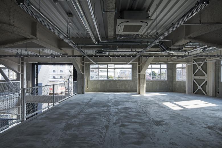 建物の健全化のためのハンチとブレースによる耐震補強、設備の刷新とともに、階をまたぐ大扉と吹抜けによって大規模製作、荷捌き、イベントなど多目的に利用される外部に開かれた空間を設えた。製作を下支えする空間を、即物的かつ最小限の対応で実現している。