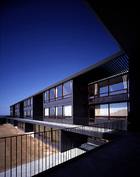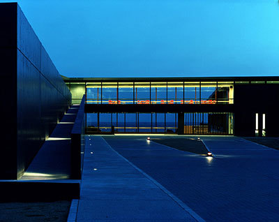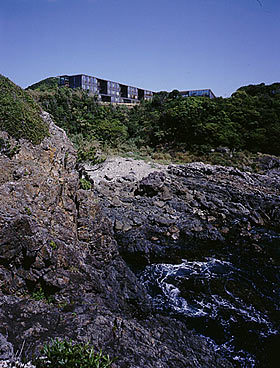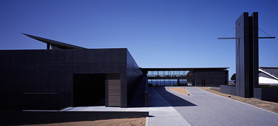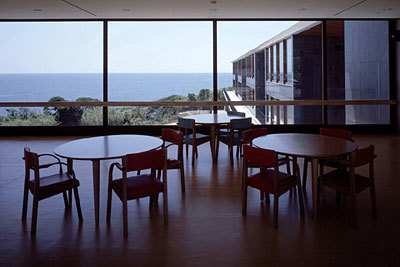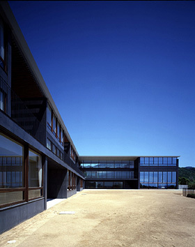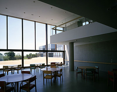 The expanded Z-shaped building is laid along an axis running from the mountains on the north to the sea on the south. The large open space along the building has been divided into a pair of L-shaped fields; one is the approach to the entrance, facing the mountains, and the other is the lawn-covered garden, facing the ocean. A transparent space has been created via glazed windows in the middle section of the building to produce a sense of free spatial flow from the mountains to the ocean.