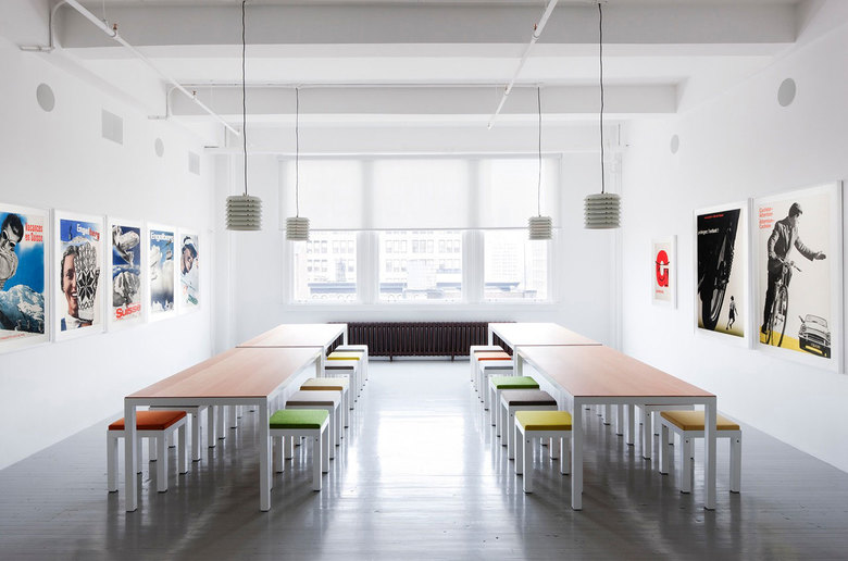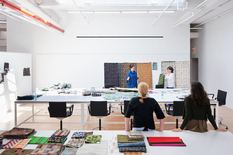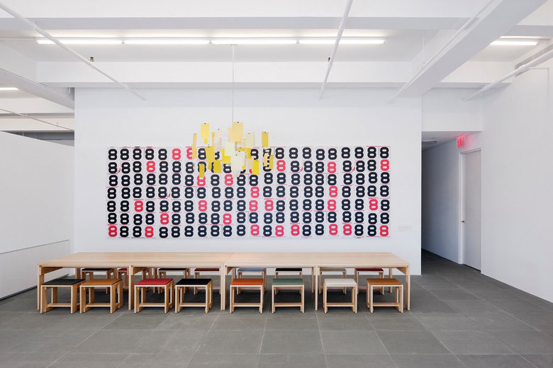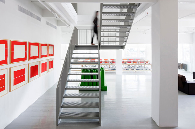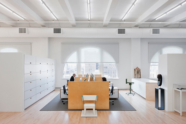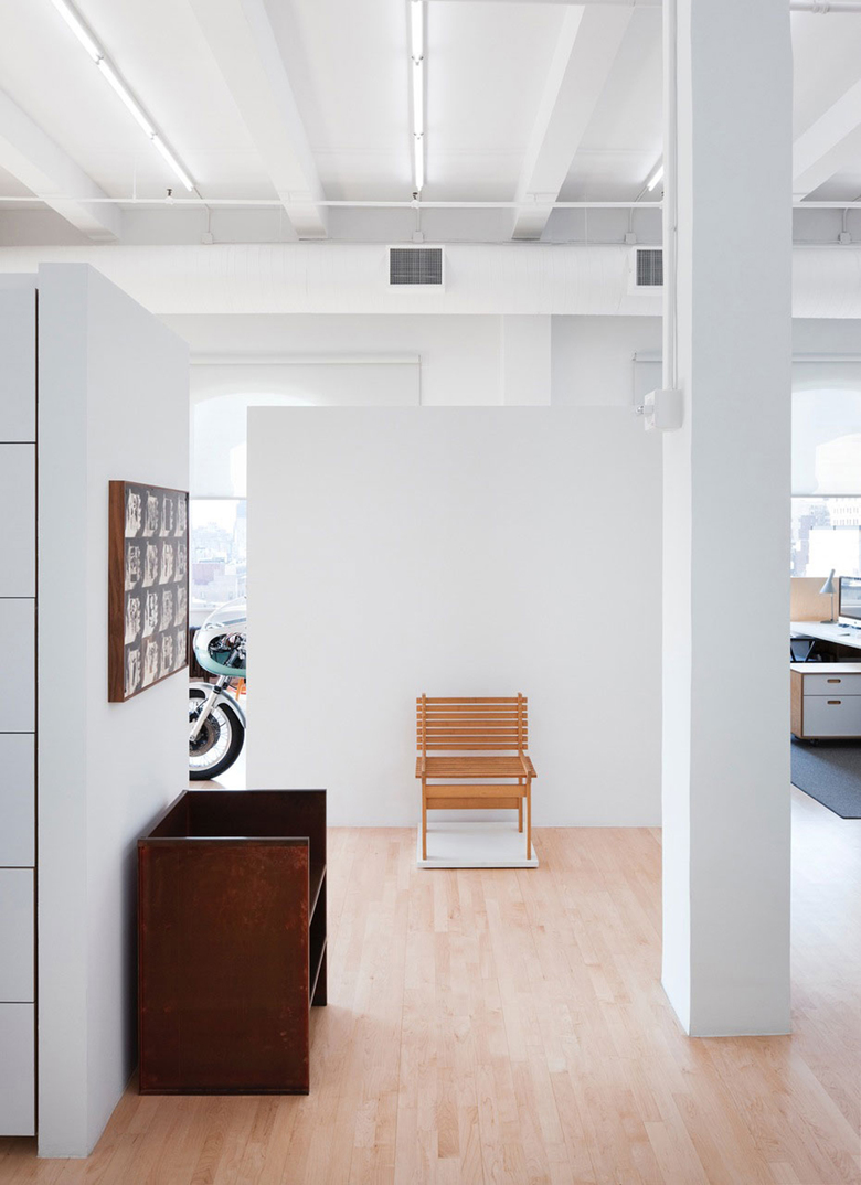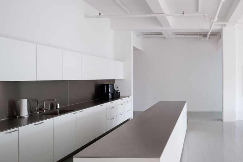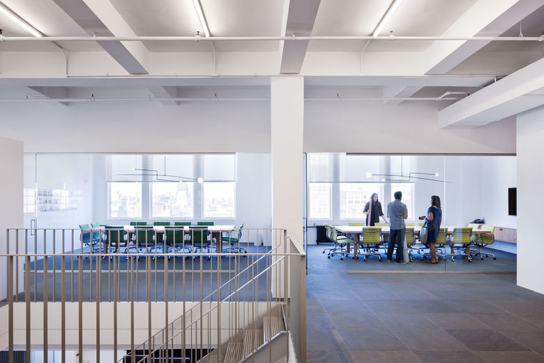 The textile company Maharam expanded to the floor below their existing two-story showroom, to occupy floors 14-16 of a Park Avenue South building. A staircase was added between floors 14 and 15, connecting the middle floor conference rooms and offices with the lower floor conference room, sample display area, photo studio, kitchenette and canteen. The renovation improved the circulation of the overall space by making more access points to the different functions: instead of a warren of crowded rooms, circulation wraps a single core. New windows allow abundant natural light into the space, and the glass- walled conference rooms and offices enjoy auditory privacy while admitting daylight through the entire floor depth. Simple, restrained finishes grey painted wood and stone flooring keep the office airy and light.