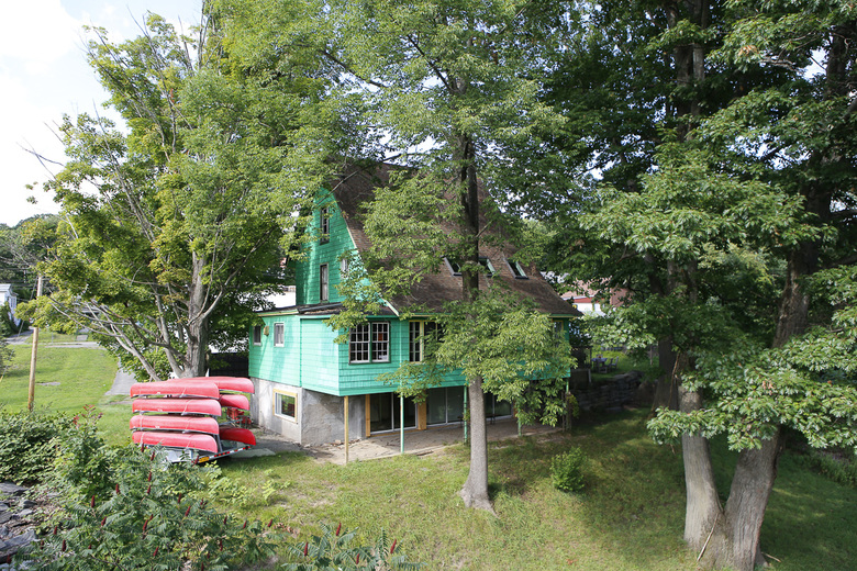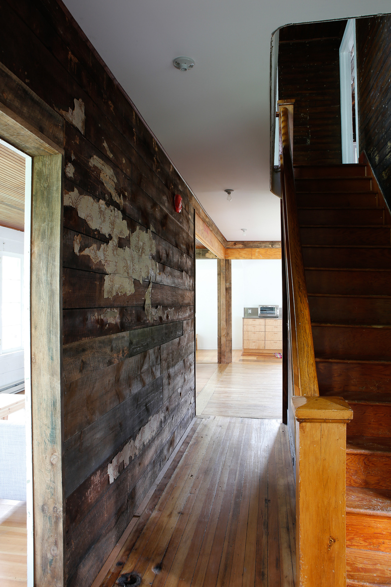 Both structures were an amalgamation of additions stitched together over several decades. The portion of the garage closest to East Front Street had once been a gas station built from a design template developed by the industrial designer Raymond Loewy. Horizontal masonry banding, its signature design feature, are still partially visible on the interior. A subsequent renovation enclosed the exterior space transforming it into a car dealership by adding large plate glass windows towards the street. Later, two larger volumes were added for automotive repairs. Between the back of the building and the river’s edge, lies a 3 story wood frame house. Its transformation over time is less clear. A veranda facing the river was enclosed in glass and extension to the West expanded the first floor.