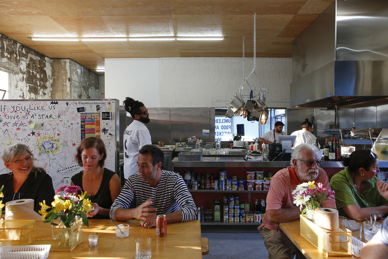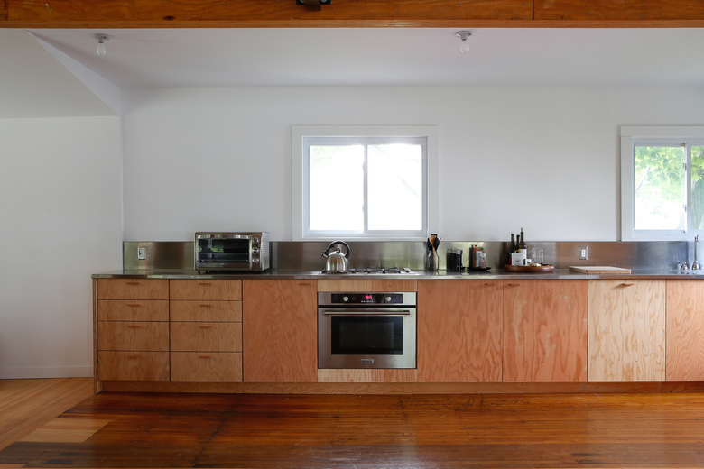 The conversion of the garage into a restaurant and gallery was done with minimal architectural means. An open kitchen, centrally located, separates front and rear exhibition spaces. A plywood ceilings and fluorescent lights were added to each volume. The existing windows were uncovered and repaired. The existing concrete floors and masonry walls were patched and cleaned with traces of its former use embraced and comfortably adapted for its new function. A similar renovation strategy was used in the house were numerous layers of finishes were removed to reveal qualities of the structures origins. The first floor and basement were opened up for use as common spaces for the multiple residents, with the upper floors partitioned into bedrooms and bathrooms.