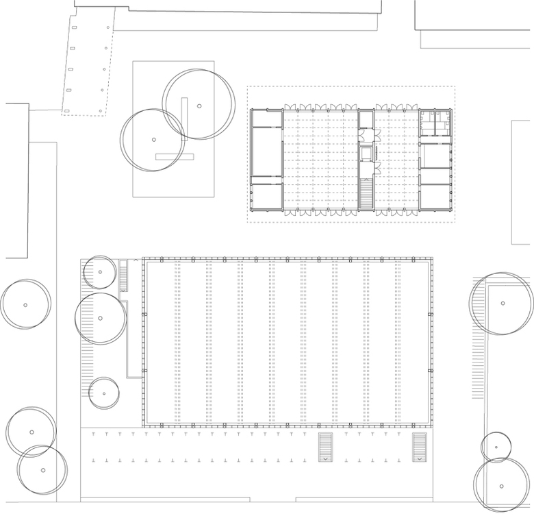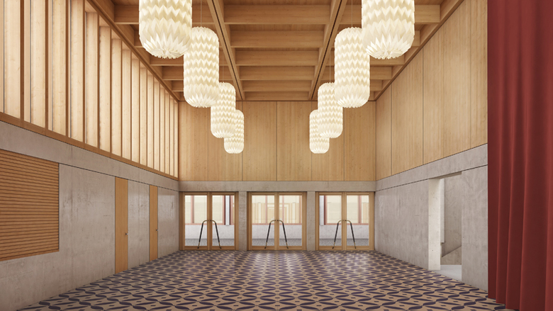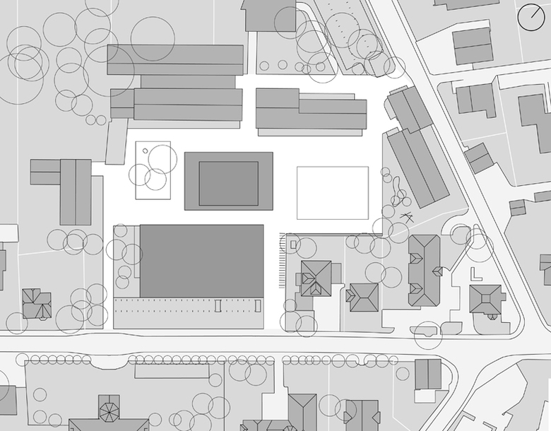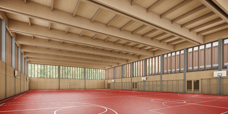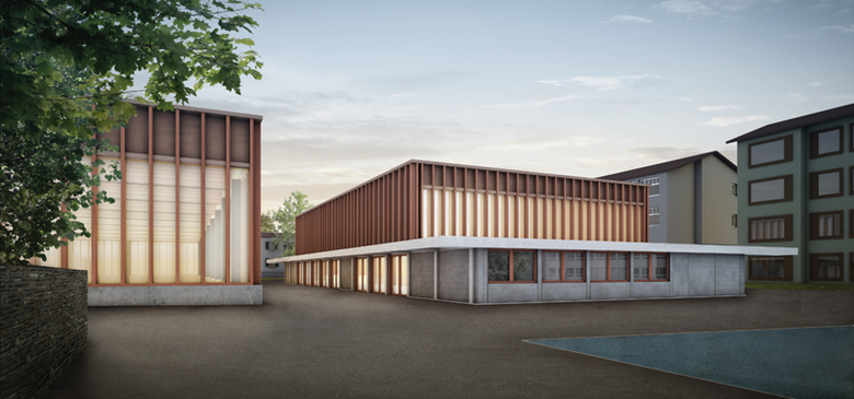 Die neue Dreifachturnhalle ist als feingliedrige, leuchtende Laterne entlang der Bahnhofstrasse gesetzt. Sie wird in das Erdreich versenkt, übernimmt so die Traufhöhe der benachbarten Häuser und reiht sich in das bestehende Strassenbild ein. Zusammen mit den Häusern der Bahnhofstrasse und den bestehenden Schulgebäuden formt die Dreifachturnhalle einen grosszügigen, zentralen Schulhof. In dessen Mitte sitzt das pavillonartige Foyergebäude und gibt dem Schulcampus räumlich wie programmatisch eine der Anlage angemessenes Zentrum.