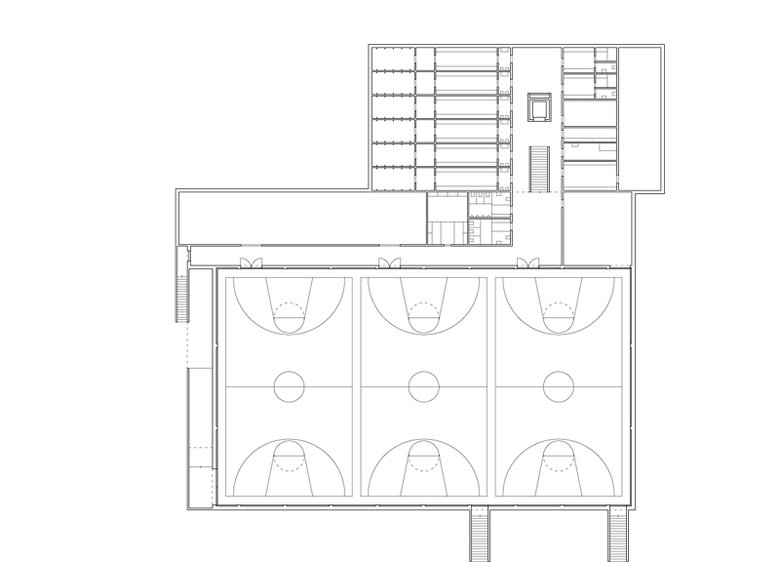 Das als Insel vorgeschlagene Foyergebäude lässt "einen" grosszügigen Pausenhof entstehen, gliedert unterschiedlich dichte Bereiche mit grosser Aufenthaltsqualität und bewirk differenzierte Raumbeziehungen. Die Zugänge zum Foyer sind zentral gelegen und gut auffindbar, sowohl von den Schulgebäuden als auch vom öffentlichen Raum. Das Foyer erschliesst gleichzeitig Aula und Dreifachturnhalle und kann durch die räumliche Nähe für verschiedene Nutzungen in Kombination mit den Aussenräumen unterteilt und vielfältig genutzt werden. Damit ergeben sich kurze Wege wie auch eine optimale Orientierung mittels spannungsvollen Sichtbezügen für Besucher oder Sportler.