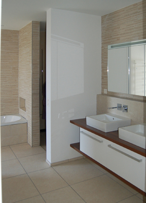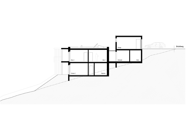 Das Gebäude gliedert sich in zwei zweigeschossige Baukörper, der Garagen/Kellertrakt liegt an der Strasse im Norden der Parzelle und ein Geschoss nach unten versetzt befindet sich der Wohn-/Schlaftrakt.