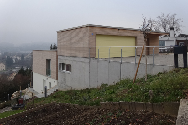 Das Einfamilienhaus liegt auf einem steil abfallenden Grundstück. Die Erschliessung erfolgt von einer Quartierstrasse von oben.