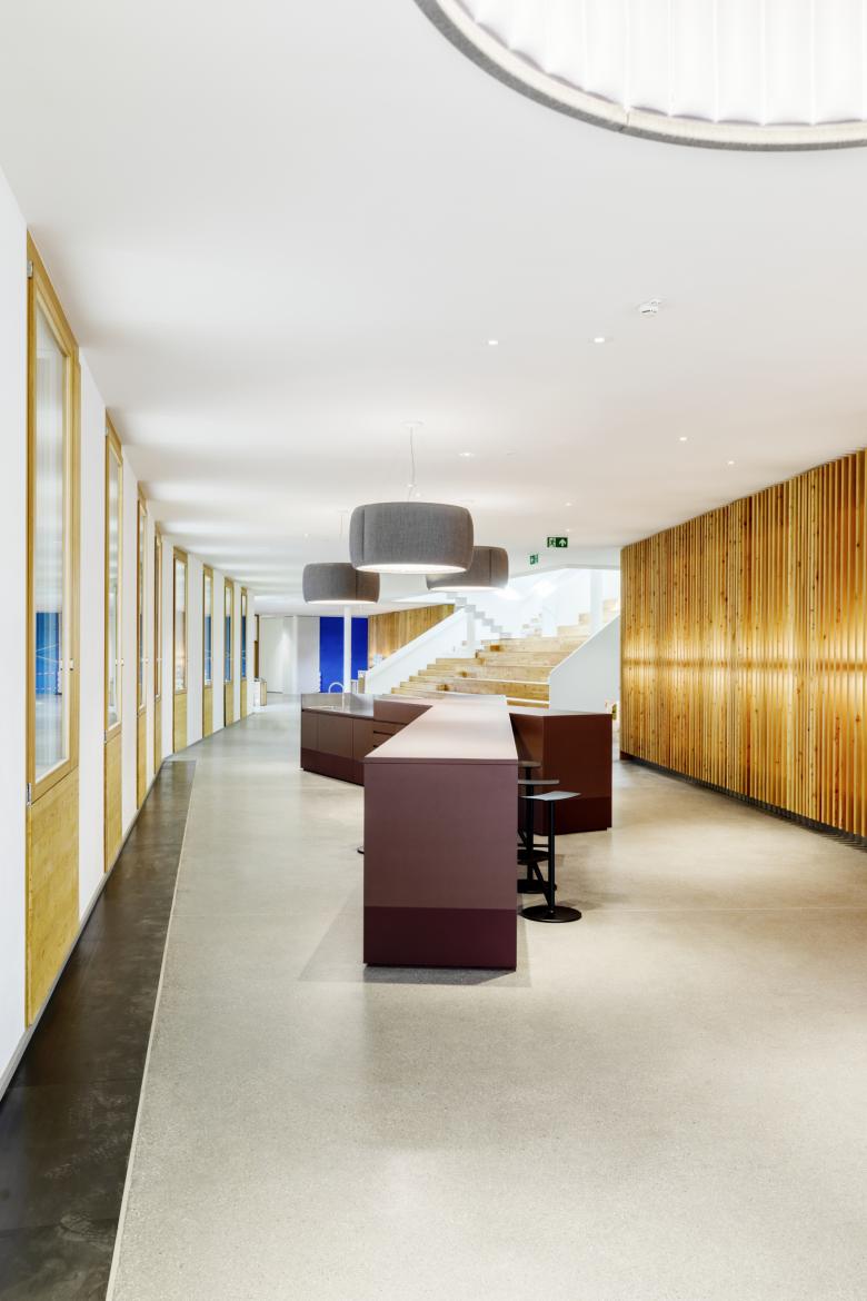 Die Hülle ist kompakt gehalten und der Fensteranteil optimiert. Im Zusammenspiel mit Fenstern, Sonneneinstrahlung und Abwärme schaffen die temperatur- und luftfeuchtigkeitsausgleichenden Oberflächen und Materialien ein angenehmes Raumklima, ohne aktive Heizung oder Kühlung. Mit einem insgesamt passiven, cleveren Raum- und Konstruktionssystem und dem absolut minimalen Einsatz von Haustechnik ist das Gebäude ein im Betrieb CO2 neutrales Bürohaus.