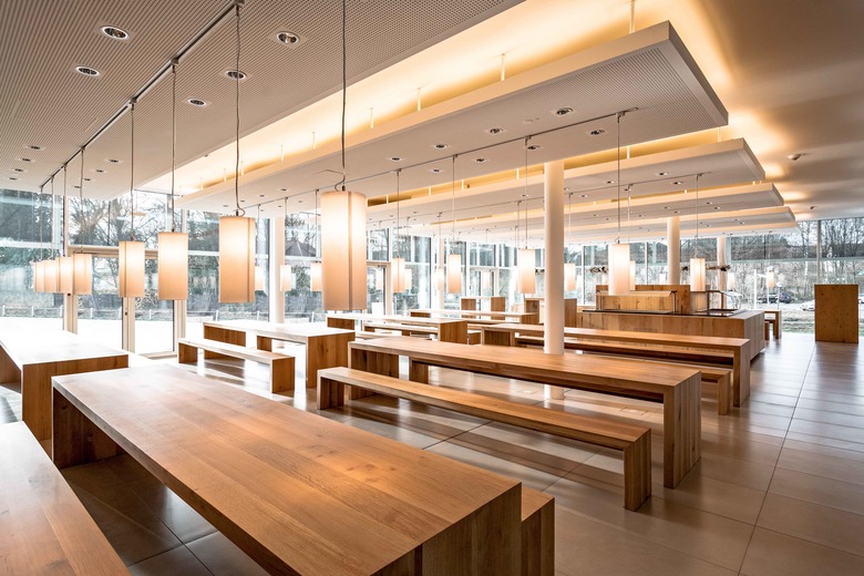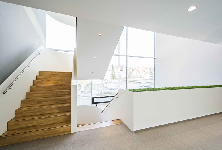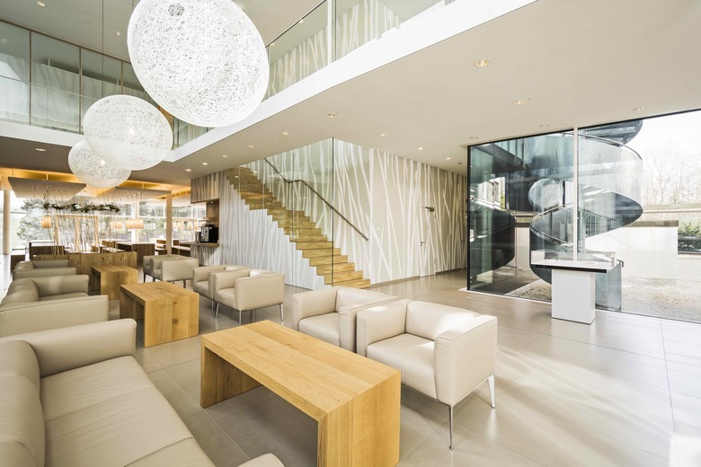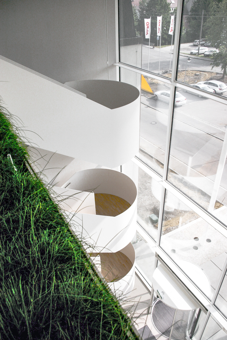 Update für die Hauptverwaltung aus den 70er Jahren. Mit der Entkernung des alten Treppenhauses entsteht eine lichtdurchflutete Achse zum Erweiterungsbau des Konferenzzentrums. Bereits am Haupteingang wird der Besucher von einer skandinavisch anmutenden Farbstimmung aus hellen Sandtönen und Weiß in Empfang genommen. Die abstrahierten Pflanzentexturen der Fassadengestaltung – Sinnbild für den Unternehmensbereich Garten & Hobby – finden sich als Ornament in der Wandgestaltung wieder.