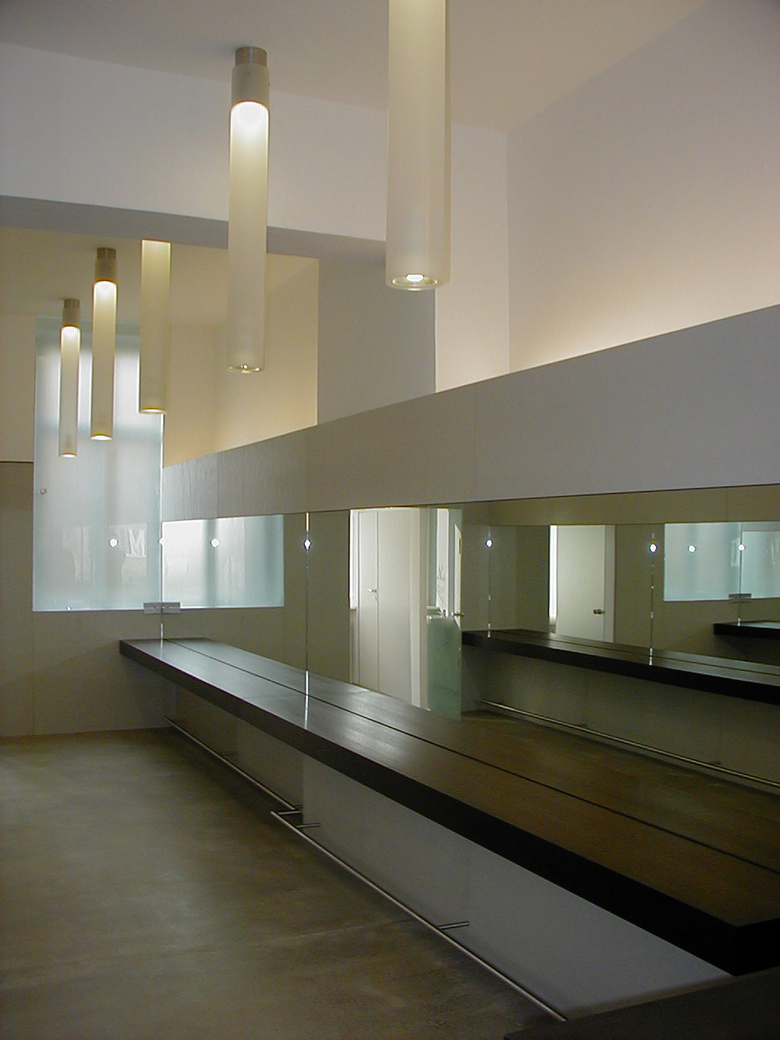 Neuer Auftritt für eine stadtbekannte Institution. Die Reduktion auf Unverzichtbares und Präzision im Detail entsprechen der formalen Sprache des Bauherrn. Beton an Böden und Wänden, kombiniert mit schlichten Einbauten aus Wengenholz. Exklusives Produktdesign der Architekten für Becken und Leuchten unterstreichen Individualität und den hohen gestalterischen Anspruch des Kunden.