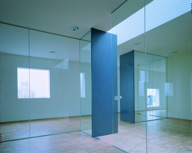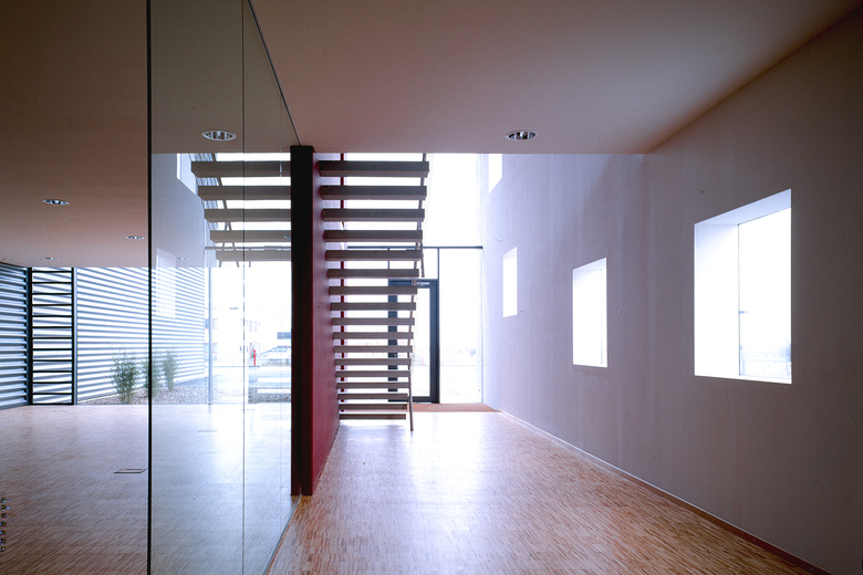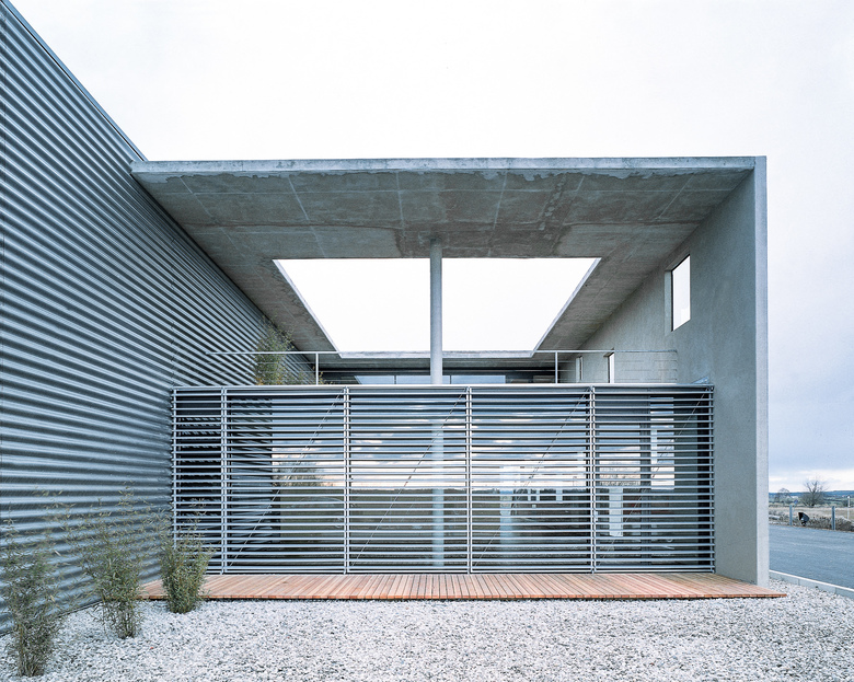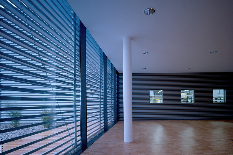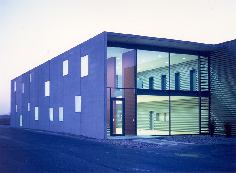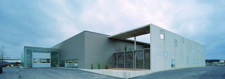 Werksanlage für die Extrusion von Kunststoffprofilen. In Form überdimensionaler Container sind die Teilbereiche Verwaltung, Lager und Logistik wie Satelliten an die zentrale Produktionshalle angedockt. Vorgefertigte Elementbauteile aus Beton und Industrieglas verleihen der Collage aus unterschiedlichen Funktionen ihr funktionales Erscheinungsbild. Ein Einschnitt im Verwaltungskubus dient als Dachterrasse und Erweiterungsoption.