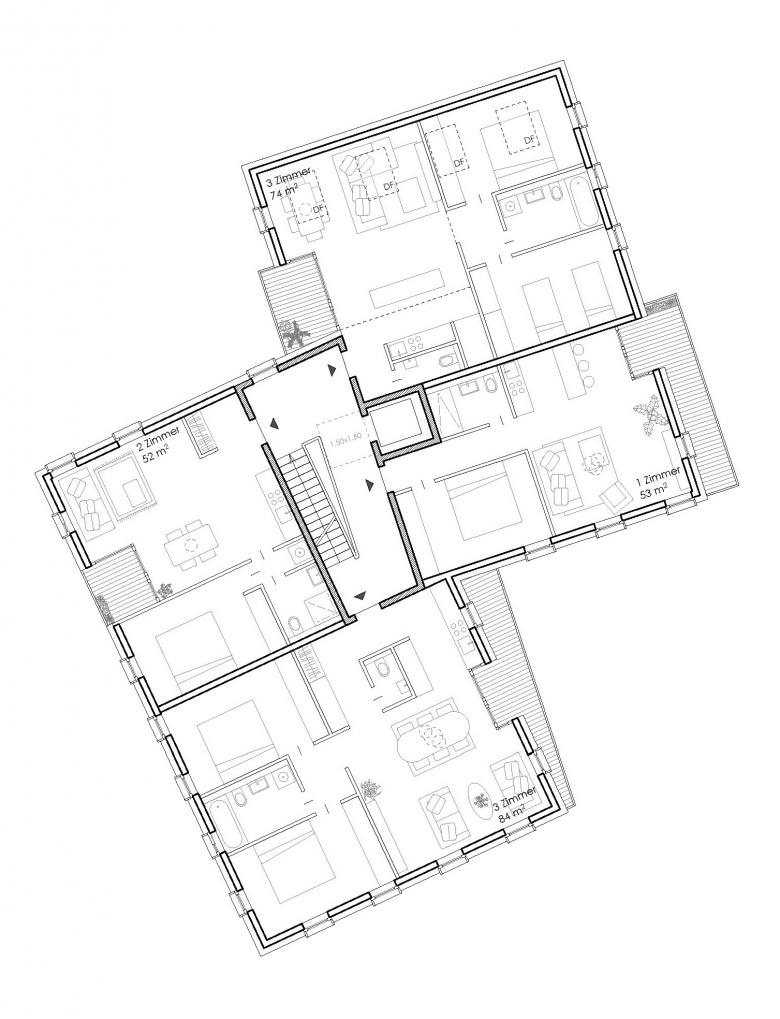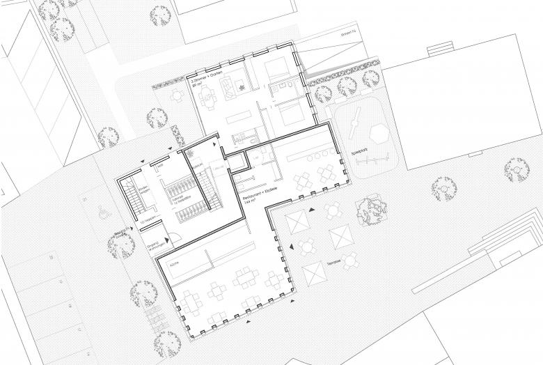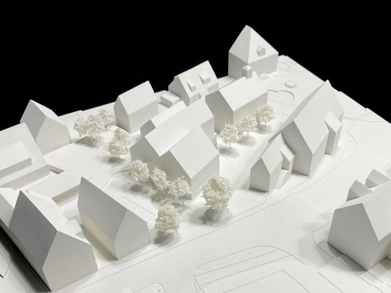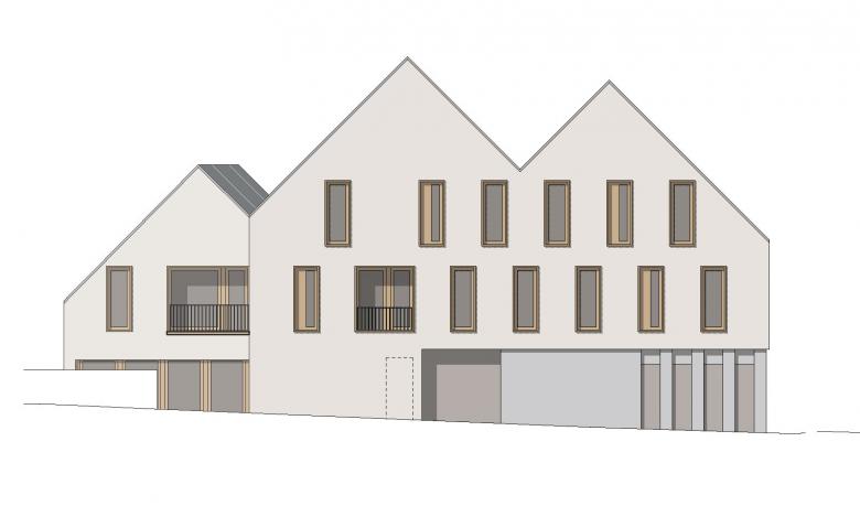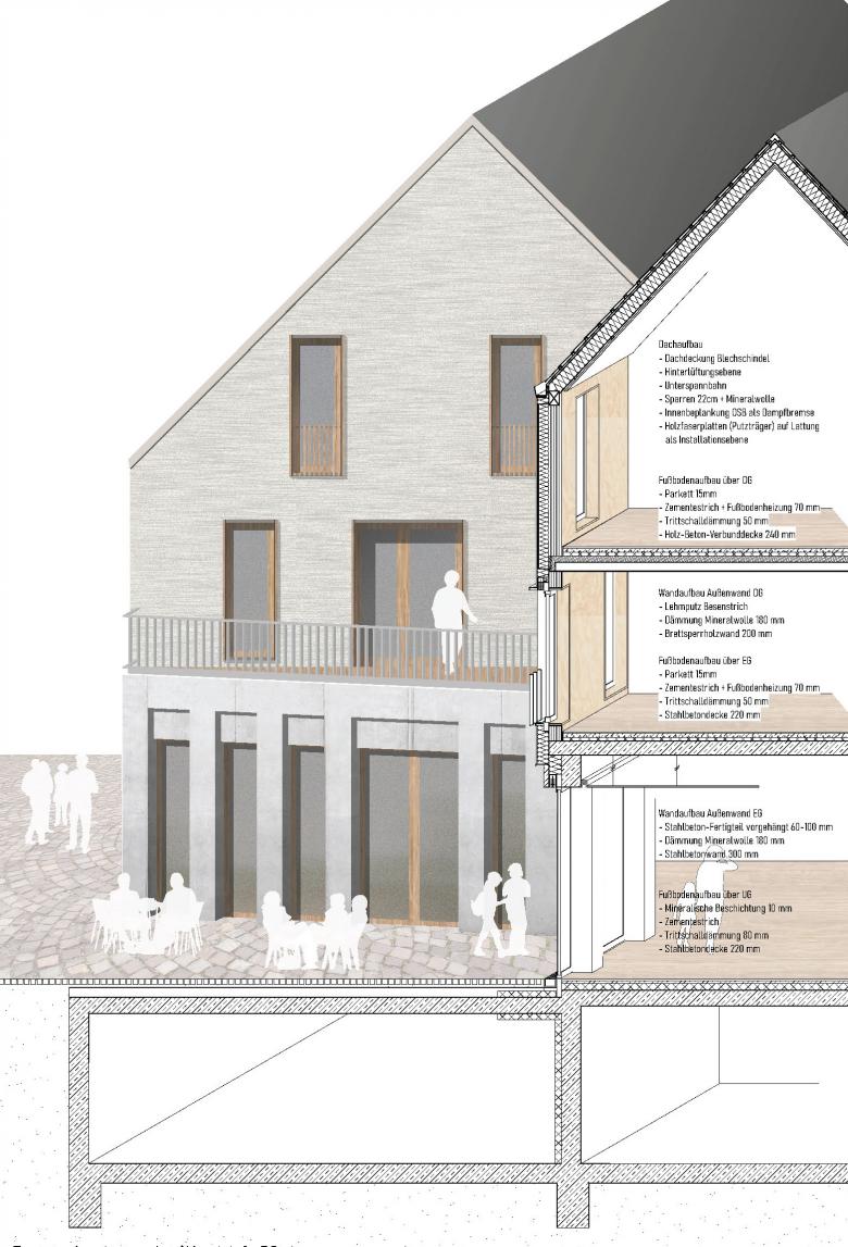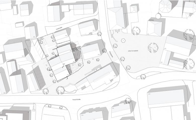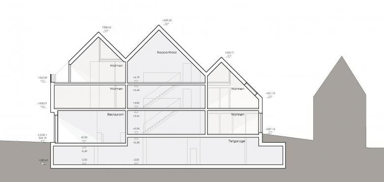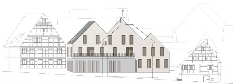 Der vorgeschlagene neue Baukörper fügt sich nahtlos in dieses Stadtgewebe. Er orientiert sich geometrisch an der historischen Substanz, nicht an den Ergänzungen der letzten Jahre. Dachform und Traufhöhen angrenzender Gebäude werden aufgenommen. Die Giebel orientieren sich zum zentralen öffentlichen Raum. Vom Platz aus sind die Gewerbeflächen im EG erschlossen. Der Zugang zum Wohngebäude sowie der separate Zugang zur Garage erfolgen von Westen.