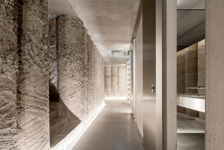Das Untergeschoss mit Vortragssaal bietet eine spannungsreiche Gegenwelt zur entmaterialisierten verglasten Stadtloggia. Die Bohrpfähle aus Beton blieben unverkleidet und dienen als herbe texturierte Raumhülle. Ihre markante Musterung aus Steinen und Erdschichten entstand durch die Drehbewegung, mit der die Bohrhülsen aus dem Erdreich gezogen wurden. Der niedrige Gewölbekeller des Altbaus wurde vor den Fundamentarbeiten ausgebaut und als Ausstellungsraum für archäologische Fundstücke wieder eingesetzt.