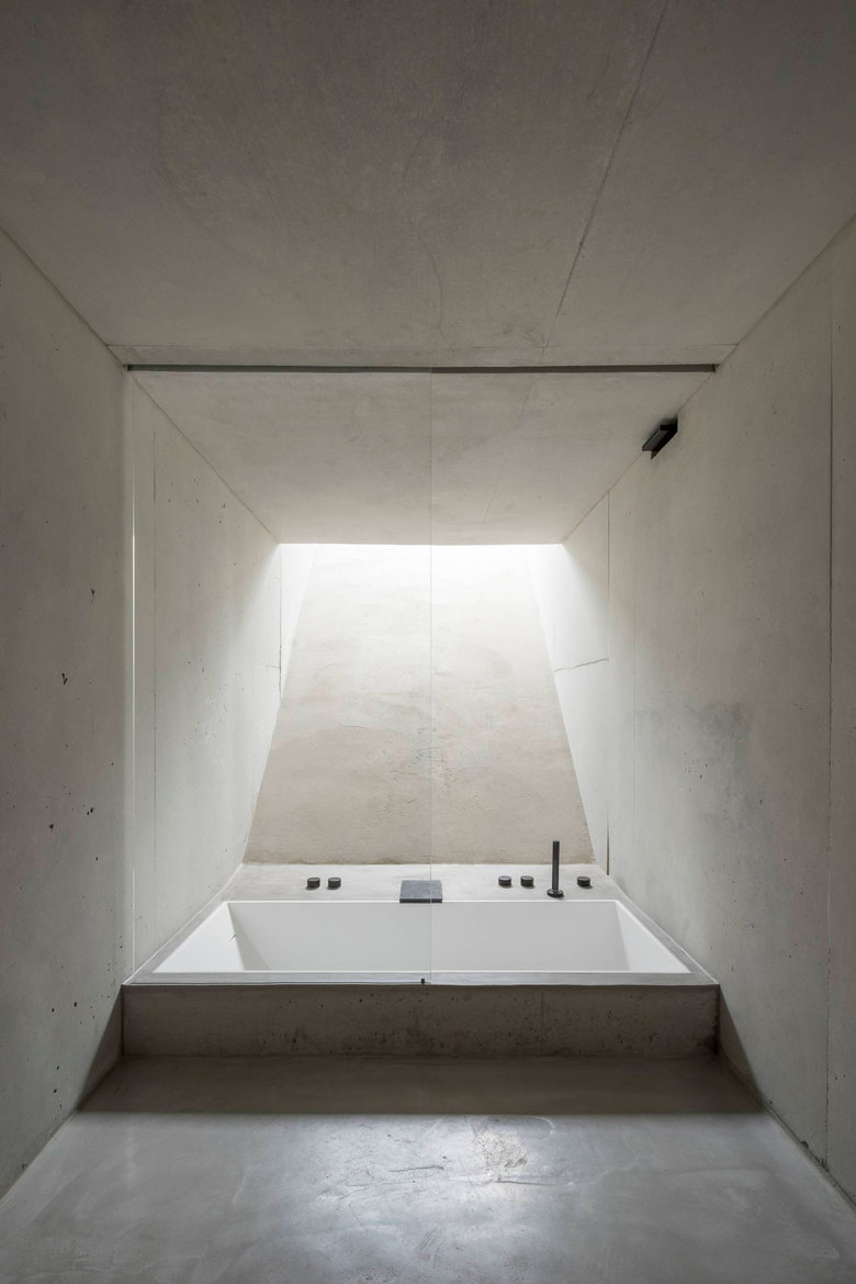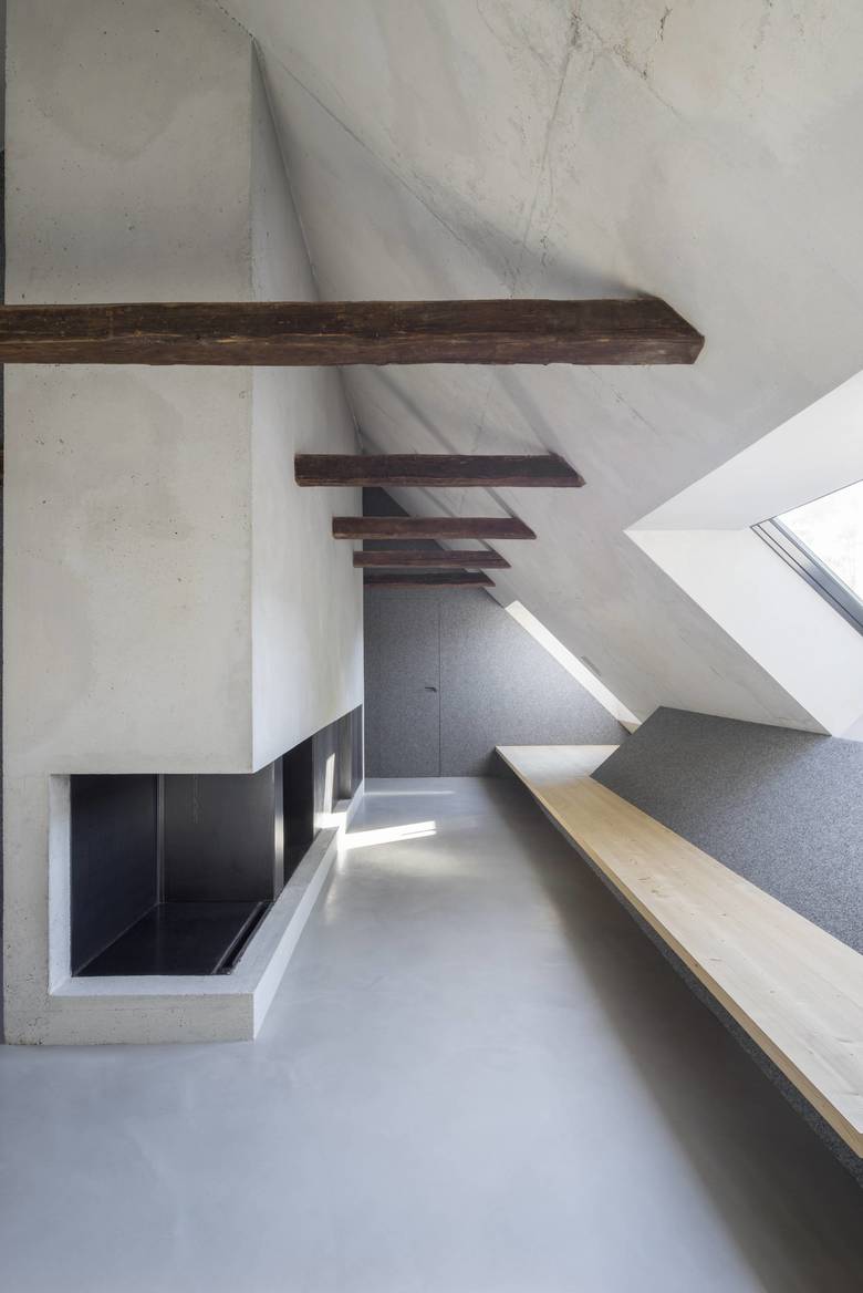 Die architektonische Konzeption geht von zwei Prämissen aus: Erhalt historischer Bausubstanz bei gleichzeitiger Einführung einer räumlichen Innovation. Daher wird „nur“ ein bestimmendes, raumbildendes Element eingefügt: ein um 45 Grad gedrehter, in den Dachstuhl eingefügter Kubus aus Beton, der sich an der Geometrie des Bestandes orientiert und über die gesamte Länge des Gebäudes erstreckt. Innerhalb dieses auf die Spitze gestellten Kubus findet sich eine hochmoderne Einheit in dem ehemaligen Stall des Anwesens. Außerhalb des Kubus existiert in engem Bezug zum Bestand eine zweite Einheit, die das Historische so weit als möglich erhält und spürbar werden lässt. Da sich der Betonkubus von Norden nach Süden staffelt, verschränken sich Raumteile des Bestandes mit Elementen des Kubus.