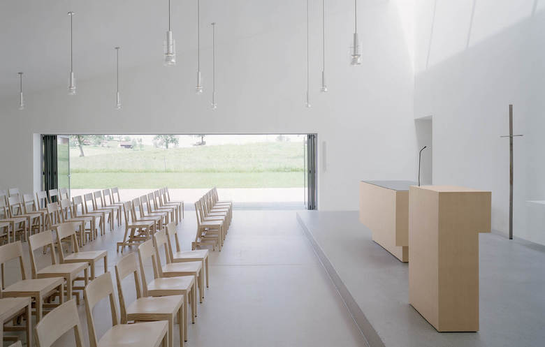 Der Eingang auf der strassenseitigen Fassade wird mit einer perforierten Eingangspartie aus bronzefarbig eloxiertem Aluminium markiert. Nach durchschreiten des Vorraums öffnet sich ein schlichter sakraler Raum mit Blick in den Garten. Das geneigte Dach findet den Abschluss über dem Altarraum mit einem durchgehenden Oblichtband. Dieses lässt zenitales Licht in den Kirchraum eindringen. Der Kirchenraum soll klar und einfach gehalten ein Ort der Ruhe und Besinnung sein. Der angrenzende Gemeinschaftraum kann durch Öffnen der Faltschiebewände direkt mit dem Andachtsraum verbunden werden. Ein separater Zugang erschliesst den unterteilbaren Gemeinschaftsraum und die Nasszellen unabhängig vom Andachtsraum. Die Sakristei kann von aussen direkt über den umlaufenden chaussierten Weg erreicht werden. Die Fensterfront zum Garten lässt sich auf die ganze Länge öffnen und ermöglicht einen Gottesdienst im Freien. Die Kirchenglocke ist über dem Orgelraum platziert.