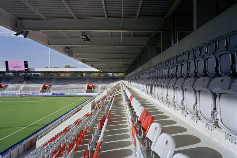 Der ebenerdige Eingang, die Nähe zum Feld und die daraus entstehende Unmittelbarkeit sind zentrale Merkmale der Arena Thun, die zur familiären Atmosphäre beitragen. Über der Haupttribüne, mit Sicht aufs Spielfeld, liegt eine in fünf Räume unterteilbare Lounge mit 350 Sitzplätzen, die auch als Konferenz-Räume genutzt werden können. Zusammen mit dem Grün des Fussballrasens prägen Weiss und Rot das Erscheinungsbild - die Vereinsfarben des FC Thun. Hauptfarbe im Äusseren ist ein leicht gebrochenes Weiss, das Beton- und Stahlteile verbindet, während feuerrote Eingänge das Grau der Sitzplätze und des roh belassenen Betons der Tribünen unterbrechen. Das Stadion wurde nach Minergie-Standard gebaut und ist auf dem Dach mit einer Solaranlage ausgerüstet.