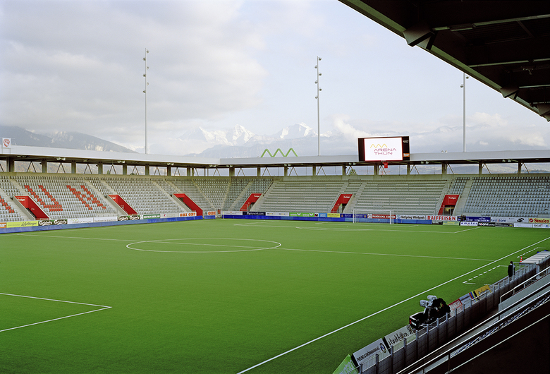 Bei der Ausfahrt Thun Süd markiert die Arena Thun den Stadteingang. Hier, vor dem spektakulären Alpenpanorama werden Sport und Einkaufen zum Erlebnis. Das Super-League-taugliche Stadion bietet 10'000 Zuschauern Platz und wirkt trotz seiner Grösse überschaubar. Mit lediglich 14 Metern Gebäudehöhe fügen sich Arena und Panorama-Center in die Alleen der Thuner Allmend ein.
