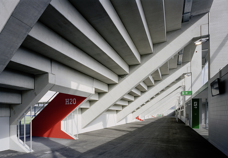 In seiner Gestaltung präsentiert sich das multifunktionale Stadion dynamisch, elegant und hell. Die Aussenansicht wird geprägt von der dreiteiligen horizontalen Schichtung von Sockel, Netz und Dachrand. Mit ihrer Transparenz gibt die Hülle stets die Sicht frei, von aussen in die Betonstruktur der Arena, vom Stadioninnern ins Bergpanorama. Die mit LED-Lampen bestückten Diagonalen treten zusammen mit der Spielfeldbeleuchtung vor allem bei Dämmerungs- und Nachteinfall in Erscheinung und kennzeichnen das Stadion von Weitem.