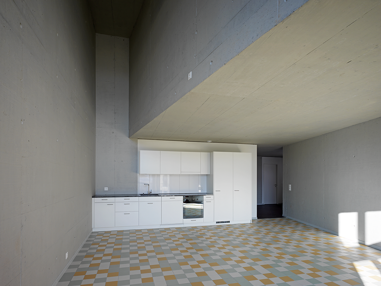 Das kompakte, prismatische Gebäudevolumen eignet sich für eine monolithische Bauweise in Dämmbeton, kombiniert mit einem rohbauähnlichen Ausbau im Inneren. Das Erdgeschoss wird mit Gemeinschafts- und Gewerberäumen grossflächig genutzt und allseitig nach aussen geöffnet.