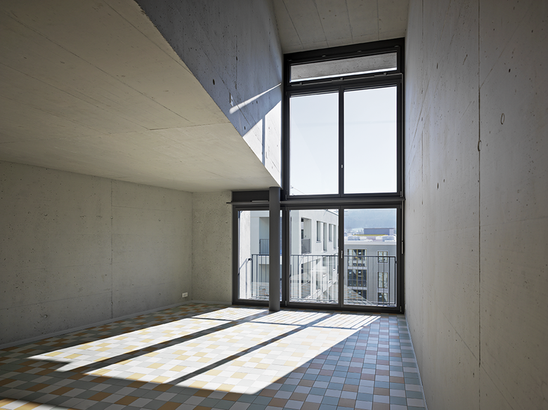 Haus G steht im Zentrum des neuen Quartiers, angrenzend an den Hauptplatz. Die übergrossen Wohnräume kompensieren die fehlenden Aussenräume und bringen mit doppelgeschossigen Raumkeilen Licht in die tiefen Grundrisse. Prägend für den Ausdruck des Bauwerks sind die grossflächigen Verglasungen der doppelgeschossigen Wohnräume die sich wechselseitig verzahnen und den rigorosen Baukörper aufbrechen.