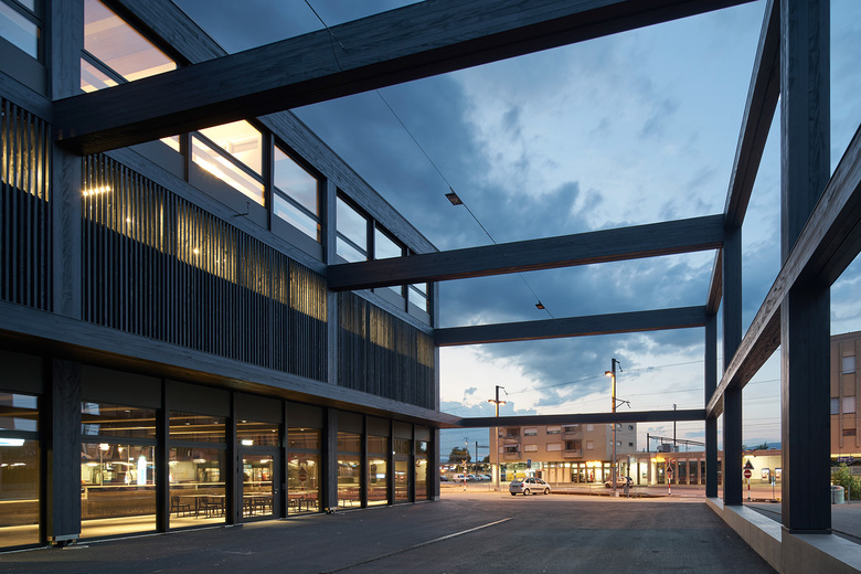Der blau schwarze Holzbau weist mit seiner klar lesbaren Struktur auf die grossen Räume im Innern hin. Die innovative Holzbautechnologie, verbunden mit einer duldsamen Holzkonstruktion in Bezug auf technische Bearbeitung und verschiedenste Oberflächenbehandlungen, ermöglicht eine Fülle an szenografischen Interventionen in den Innenräumen und macht selbst die Aussenhülle für Ausstellungszwecke bespielbar. Dank effizienter Wärmeerzeugung und einer guten Gebäudehülle können die Betriebskosten niedrig gehalten werden. Die einfache und nachhaltige Bauweise verschafft dem Haus einen zeitgemässen Auftritt und setzt gleichermassen einen neuen Akzent im neuen Bahnhofsareal.