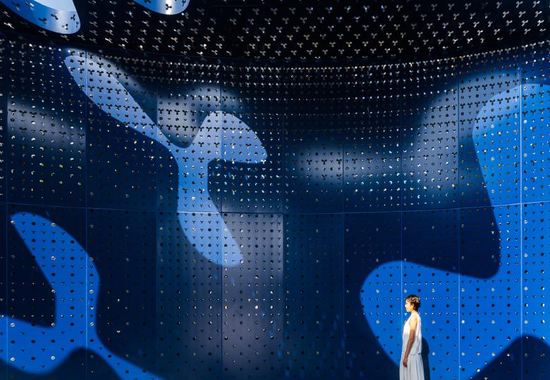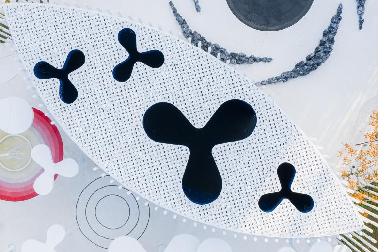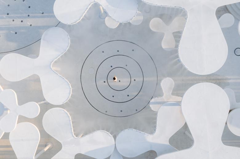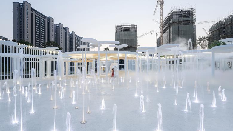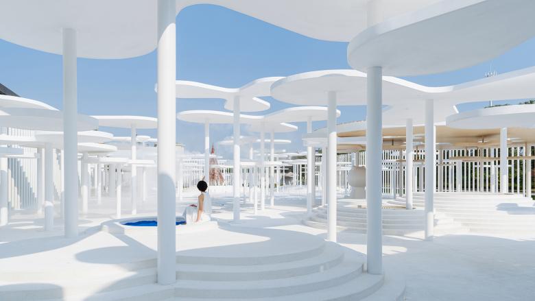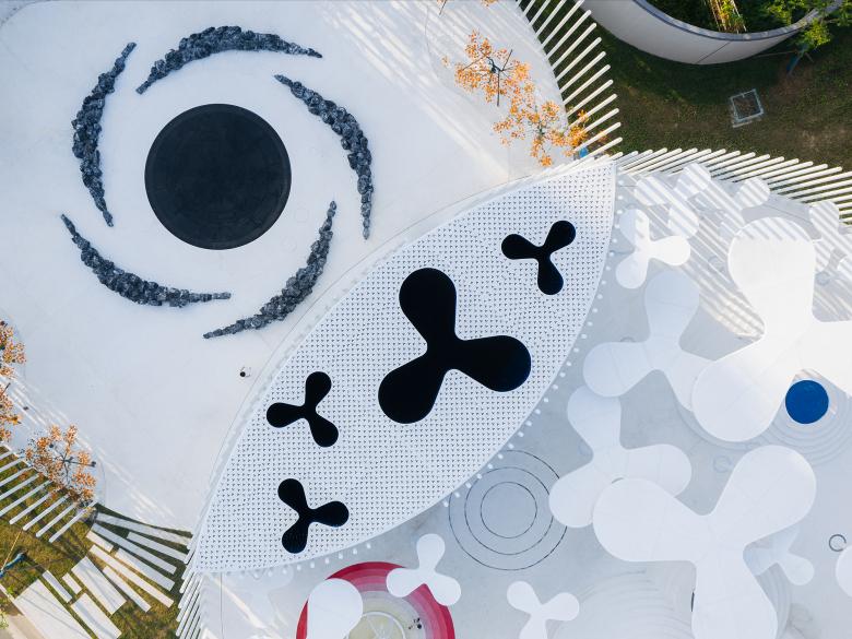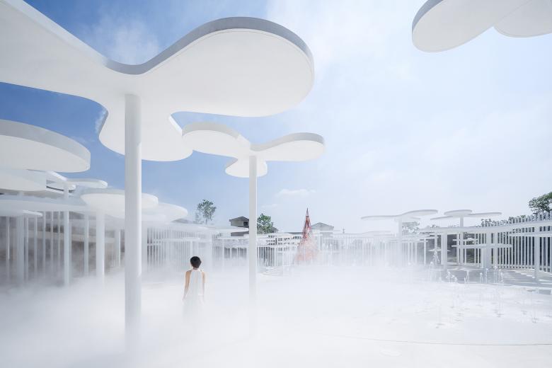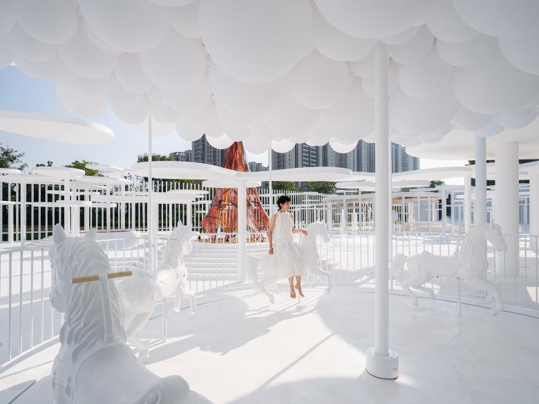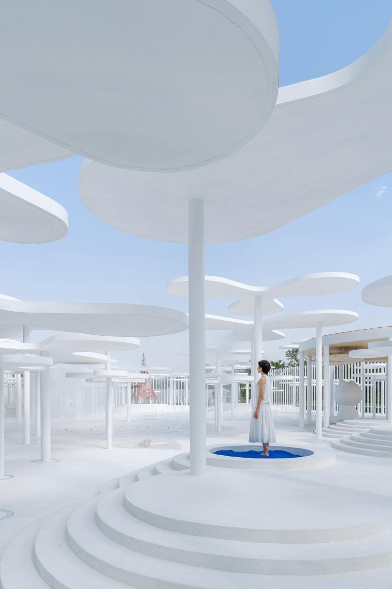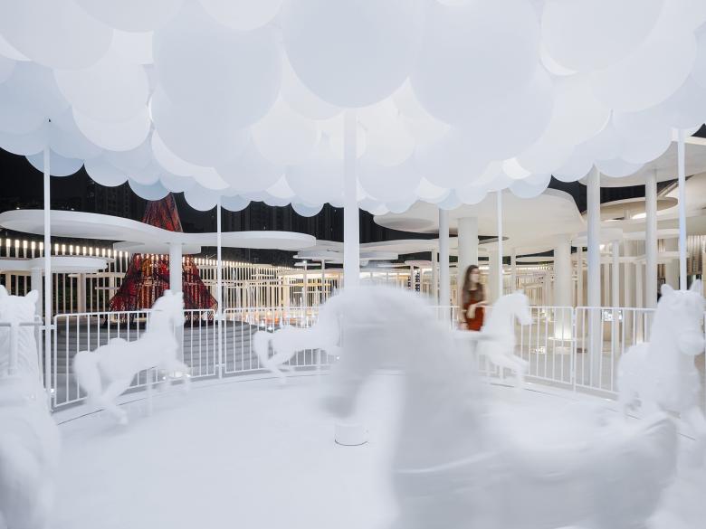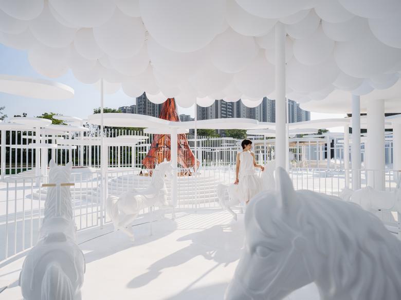You can see the Trojan horse under the clouds. This prop, which represents the innocence of an adult child, has repeatedly appeared in Yu Ting's series of dream designs. You can also see swings, colorful bunkers, stars in your eyes. These fragments, which once flashed in life, are re-fined and mosaiced into White Upland. Of course, if that's all, it's just flattery. Life is much more than that. Yu Ting is particularly fond of the fountain in Shanghai's Jing'an Kerry Center. It is not only a landscape, but also a playground for children to interact with, but also a meet-point for people to socialize. So on the plaza hidden in the forest, he set up a fountain of 117 nozzles. Opposite the fountain is the huge covered theater, where bands can perform in the summer. These two places make up the social life scene of family and friends. The bonfire in the middle of the forest is a red cone woven by the Roboticplus.ai with 5954 meters of fluorescent carbon fiber. It is a solid flame that one can enter. In the white forest, on the white hills, at the center of white upland, people can find safe and warm, or love. In this way, the unrealistic White Upland actually reflects a real life text.