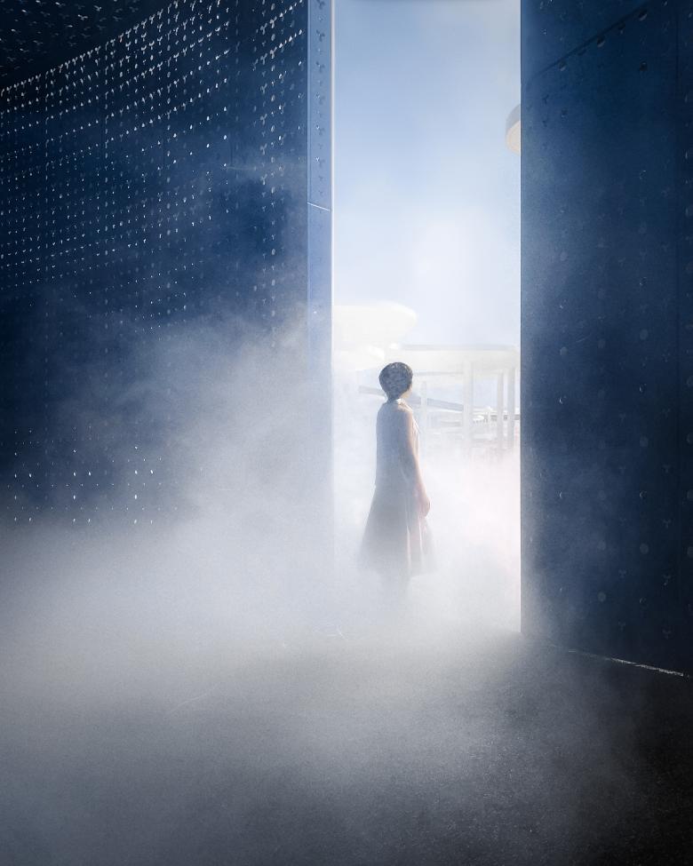 The main narrative of White Upland was inspired by Yu Ting’s daughter, Tangtang’s dream. Forest is one of the most frequent elements in Tangtang’s dream. Yu Ting used 108 white steel columns in three sizes to form this abstract forest. Then follow the visitors’ circulation, he made different landscapes, such as caves, hills, streams, rocks, highlands, waterfalls and theatres in the woods. He referenced from Rene Magritte’s painting, to abstract those landscapes. He also used facilities to create weather here, then it has starry sky, cloudy sky, sunrise, fog, sounds and smells from the nature, and a bonfire. Making them white makes all of them surreal. Eventually, Yu Ting succeeded in using the most generic materials and manipulations to build an exuberant anti-genetic dream-land, a 3300 m2 White Upland by 106 tons of steel.