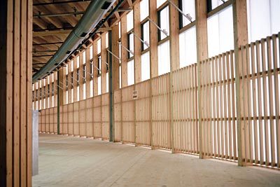 und deren parallelen Zusammenfügung. Die regelmässig sichtbaren Balken zwischen den Fachwerkträgern rhythmisieren die Deckenbereiche angenehm und verleihen dem Bau eine verständliche Dimensionierung. Bodenplatten und Balkenlage wirken im Verbund. Die Aussteifung der Holzkonstruktion und der Fassadenseiten erfolgt durch die räumlichen, sich gegenüberliegenden Kerne aus Sichtbeton.