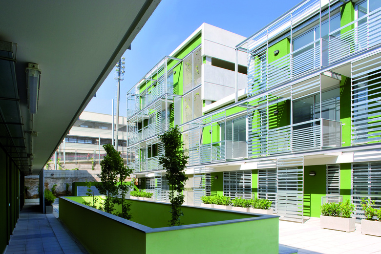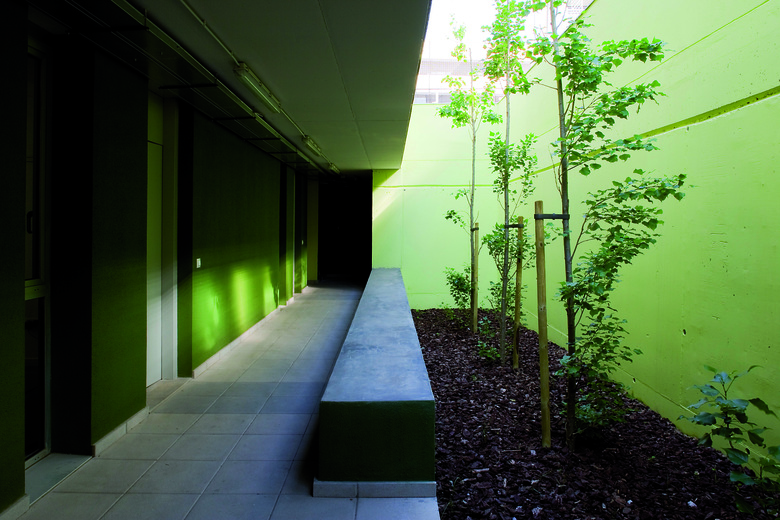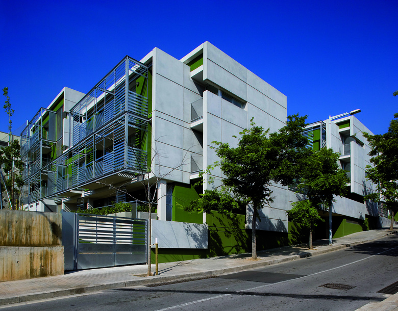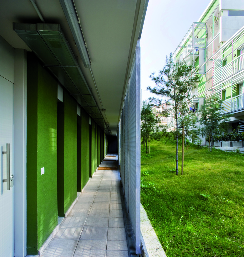 In relation to sustainability. The project takes into account the incorporation of natural elements and resources as a priority. The chosen orientation, Southeast, guarantees sufficient sunlight to all homes. Green as environmental protection. Rainwater is collected for each building and stored in two deposit tanks located in Block A and C to ensure the irrigation of the green community areas. The energy absorbed by the solar panels located on the roof of each block will be used for heating water. Galleries and overhangs facing south emphasize solar and thermal control. The layering structure of the building is a way to minimize excavations in the terrain and to control the environmental impact on the Green Area.