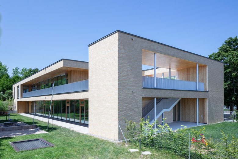 Abbruch eines bestehenden Kindergartens und Umgestaltung des Campusgeländes durch einen zweigeschossigen Neubau als viergruppige Kindertagesstätte sowie Umplanung und Neugestaltung der umliegenden Freianlagen.